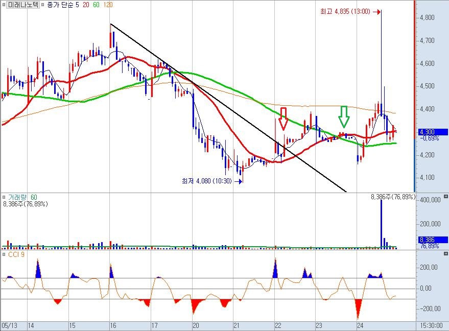 저의 기준은 캔들이 5일선 위에서 2일 이상을 머물다 5일선 아래도 다시 내려오면