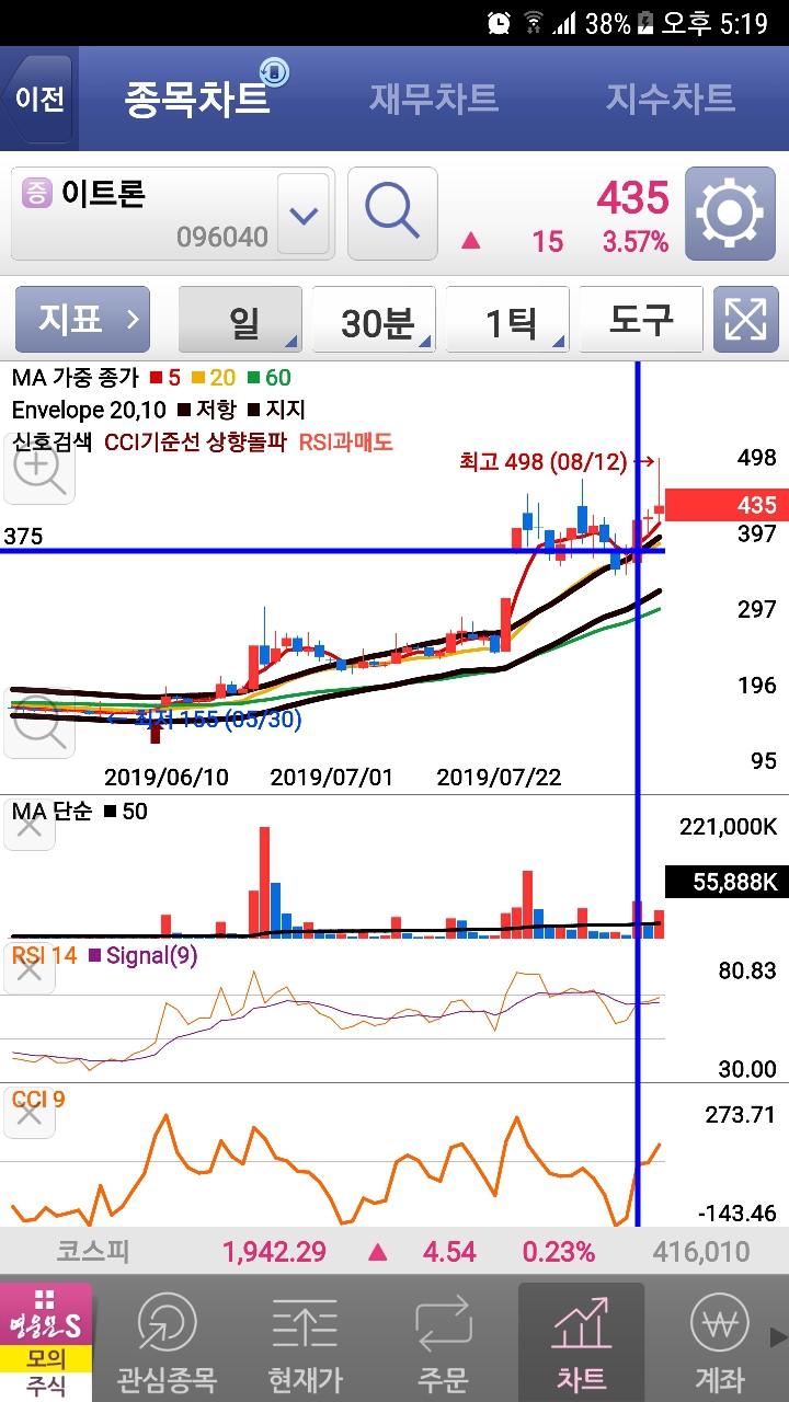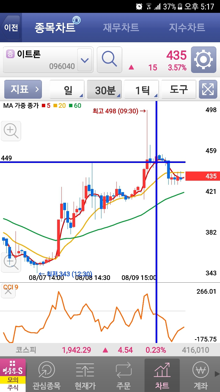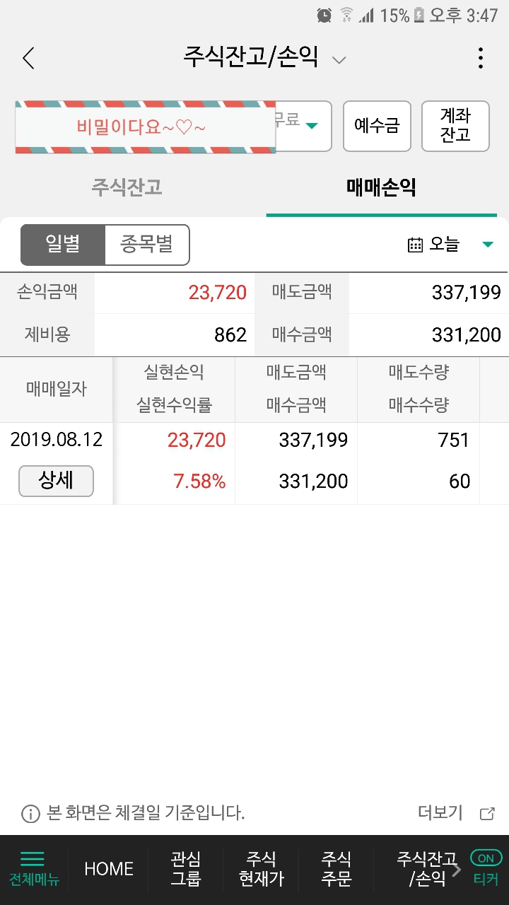 6.결과 : 최고가 후 긴 윗꼬리에 일단 매도 후 내일 시초가 보고 재 진입 할 예정입니다. 만 실수하면 동전주도 큰 손실 되니 조심 하셔요.