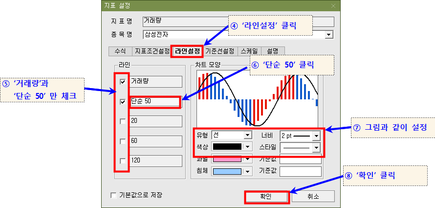 3. '라인설정'에서 '거래량'과'단순50'에만 네모에 체크 하고