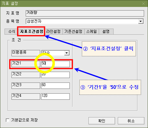 2. '지표조건설정'에서 '기간1'에 '50'이란 숫자를 입력합니다.