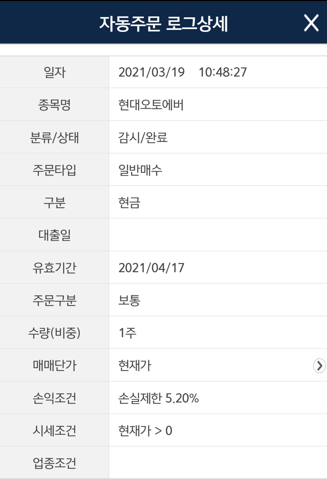 유안타증권 자동주문했는데,손실제한5.2 %해놨는데,등록하자마자 바로 체결되서,놀랬어요ㆍ자동주문은 처음이라 이것저것 누르다 시세조건을 현재가>0을 한걸 모르고 주문했네요ㆍ현재가는 0보다크니,바로 체결되었어요ㅜㅜ