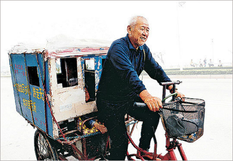칠순의 아들은 세 발 자전거에 수레를 매달고,