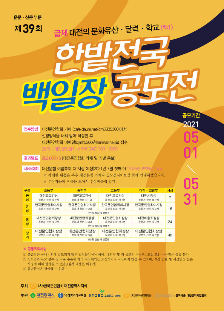 [공모전]한밭 전국백일장 공모 _ 5월 31일 작성자깨달음을 얻는 자|작성시간21.04.09|조회수3 목록 댓글 0 글자크기 작게가 글자크기 크게가 다음검색 현재 게시글 추가 기능 열기 북마크 공유하기 신고 센터로 신고 댓글 댓글 0 댓글쓰기 답글쓰기 댓글 리스트