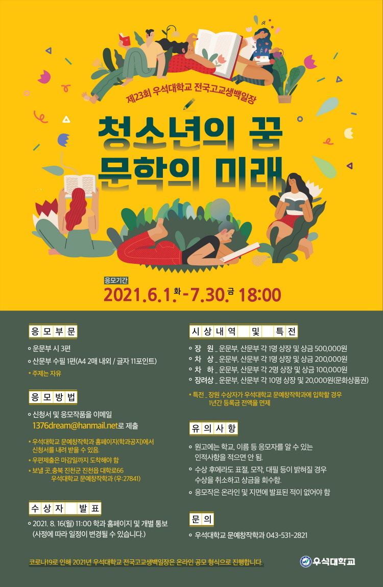 : 코로나19로 인해 2021년 우석대학교 전국고교생백일장은 온라인 공모 형식으로 진행합니다.