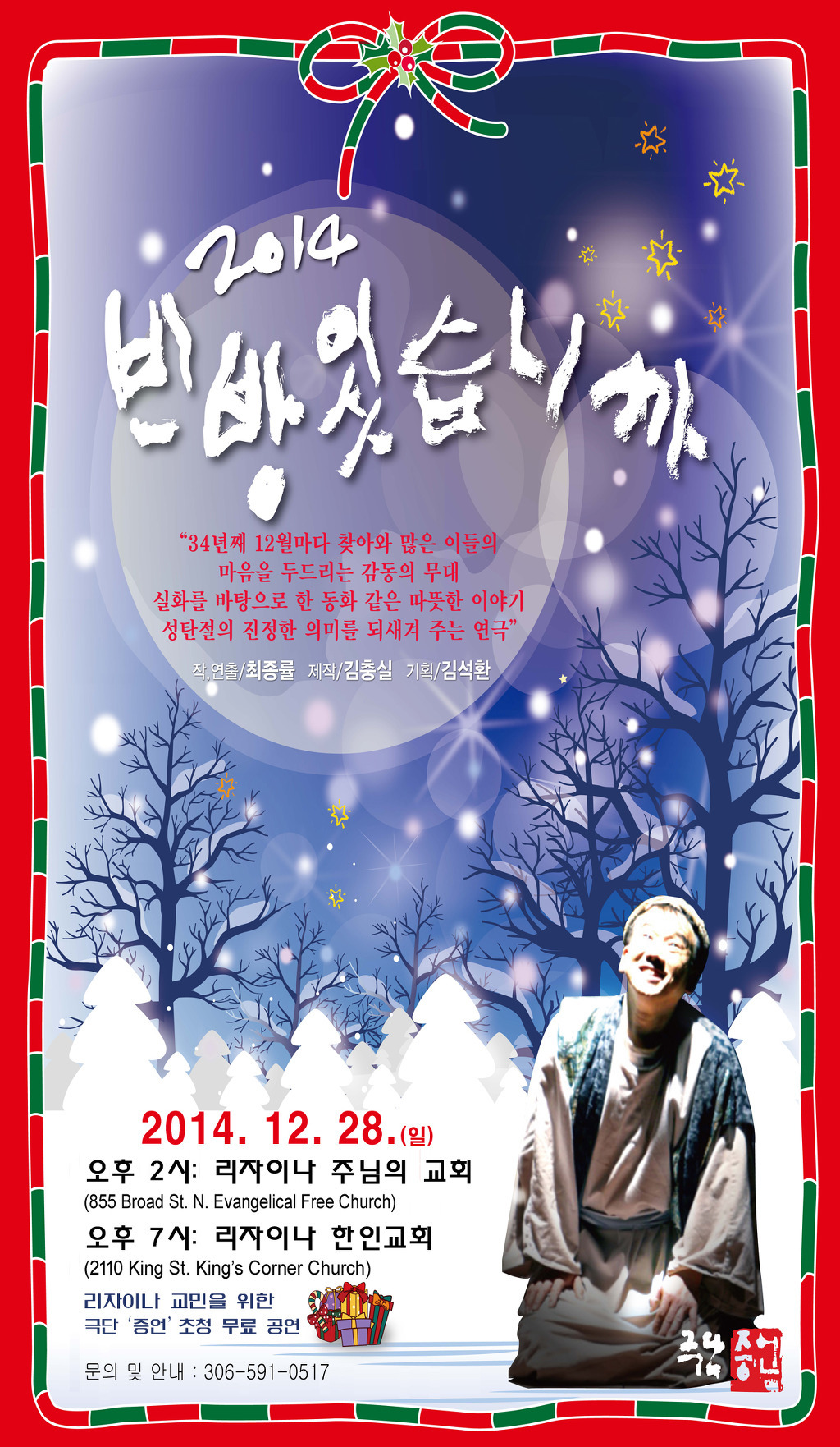 오는 12월 28일 일요일 오후 2시와 저녁 7시에 리자이나 한인들을 위해 열리는 연극 '빈 방 있습니까?' 많이 오셔서 연말 따뜻한 무료 공연 보실 수 있으면 좋겠습니다. 문화생활에 목말라 있는 리자이나 한인분들의 갈증을 해소해 줄 것입니다.
