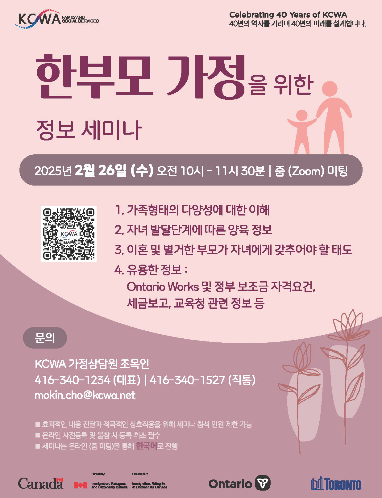 KCWA는 '한부모 가정을 위한 정보 세미나'를 2월 26일 (수) 오전 10시부터 줌 (Zoom) 미팅을 통해 진행합니다.