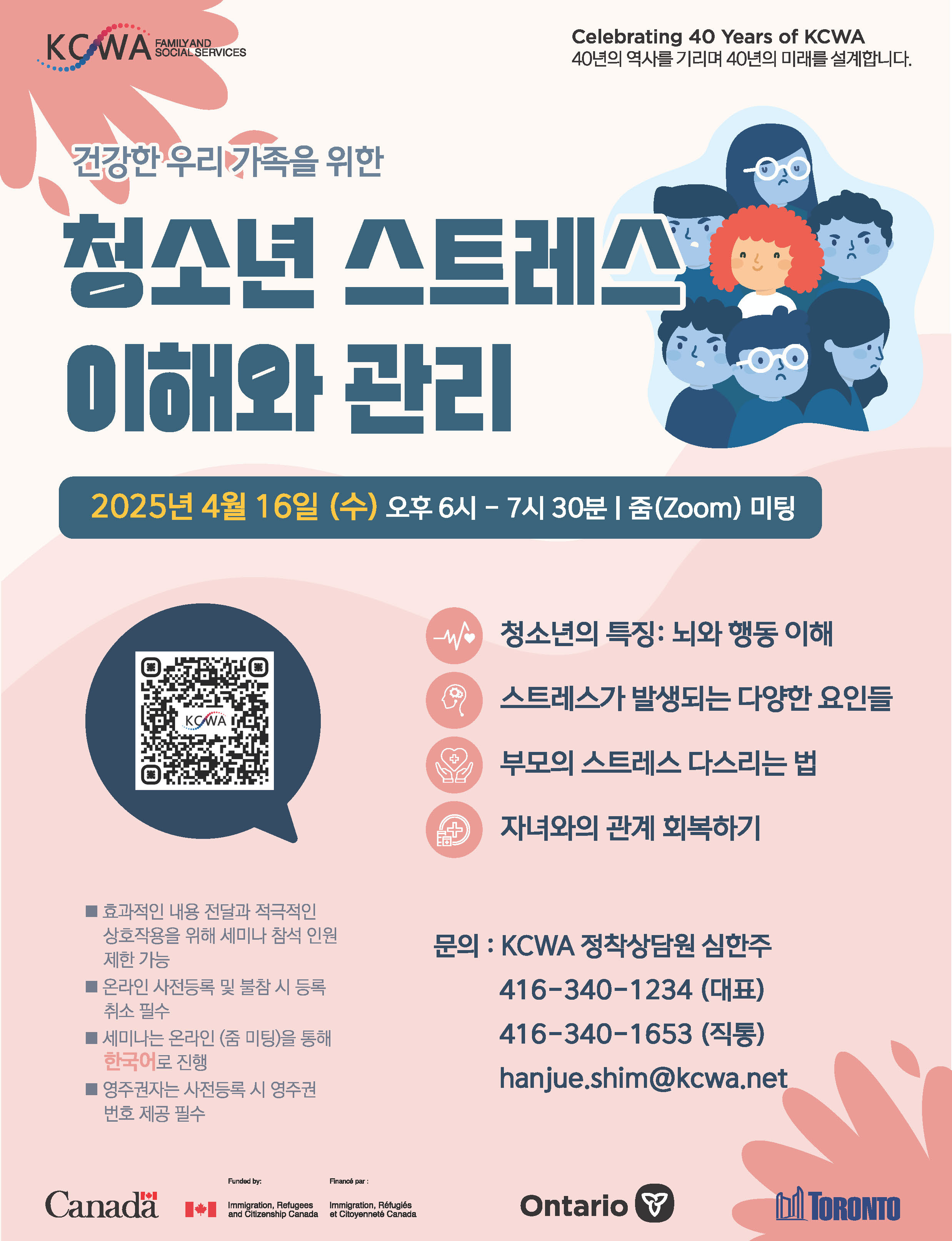 4월 16일 (수) 오후 6시 (동부시간) 줌 (Zoom) 미팅을 통해 진행되는 이 세미나에서는 청소년 스트레스에 대한 이해를 돕는 정보를 제공하고 부모의 스트레스 다스리는 법과 자녀와의 관계 회복에 대해 나눌 예정입니다.