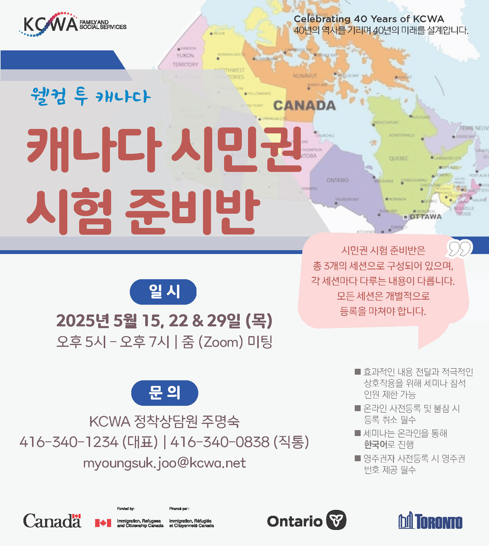 KCWA의 '캐나다 시민권 시험 준비반'이 5월 15일, 22일 & 29일 3차례에 걸쳐 줌 (Zoom) 미팅으로 진행됩니다.