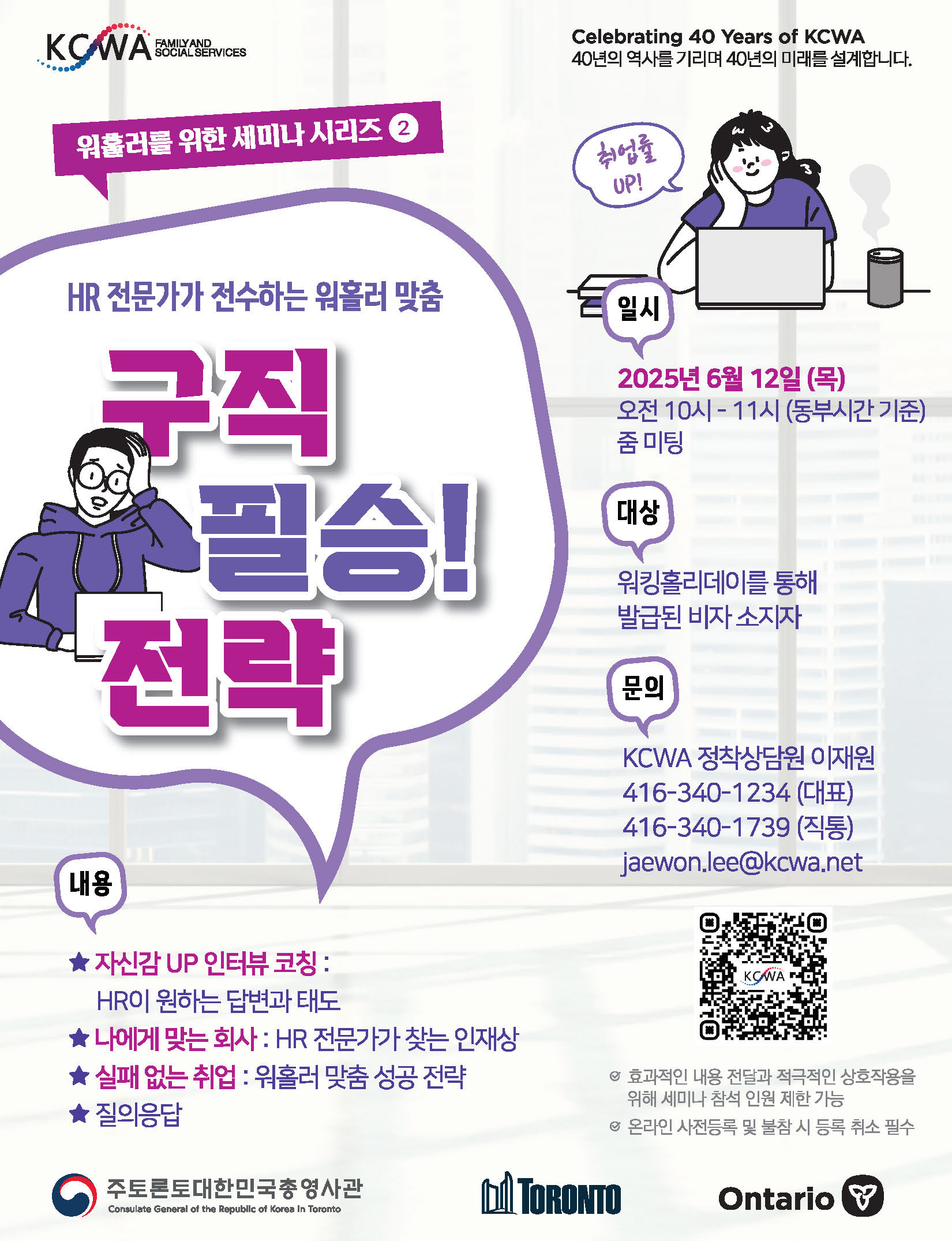 KCWA의 워홀러를 위한 세미나 시리즈 두번째 'HR 전문가가 전수하는 구직 필승 전략' 세미나가 6월 12일 (목) 오전 10시 (동부시간 기준)부터 줌미팅을 통해 진행됩니다.