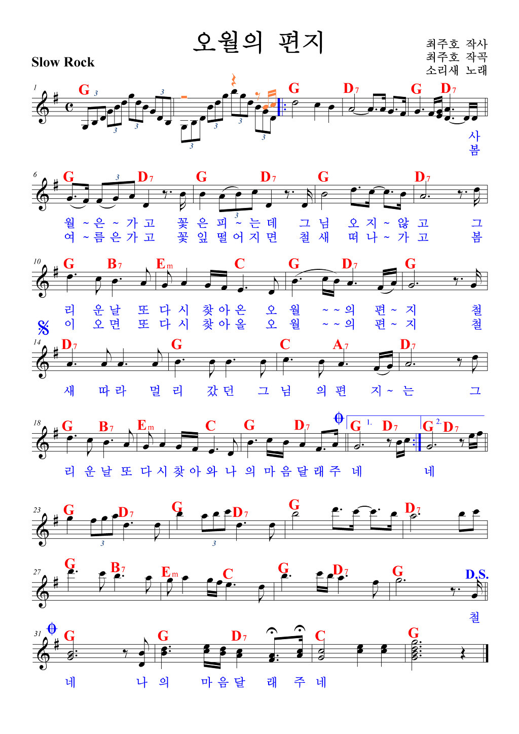 오월의 편지/최주호 작사,작곡 1. 사월은 가고 꽃은 피는데 그 님 오지 않고 그리운 날 또 다시 찾아온 오월의 편지 철새따라 멀리 갔던 그 님의 편지는 그리운 날 또 다시 찾아와 나의 마음 달래 주네 2. 봄 여름은 가고 꽃잎 떨어지면 철새 떠나 가고 봄이 오면 또 다시 찾아 올 오월의 편지 철새따라 멀리 갔던 그 님의 편지는 그리운 날 또 다시 찾아와 나의 마음 달래 주네