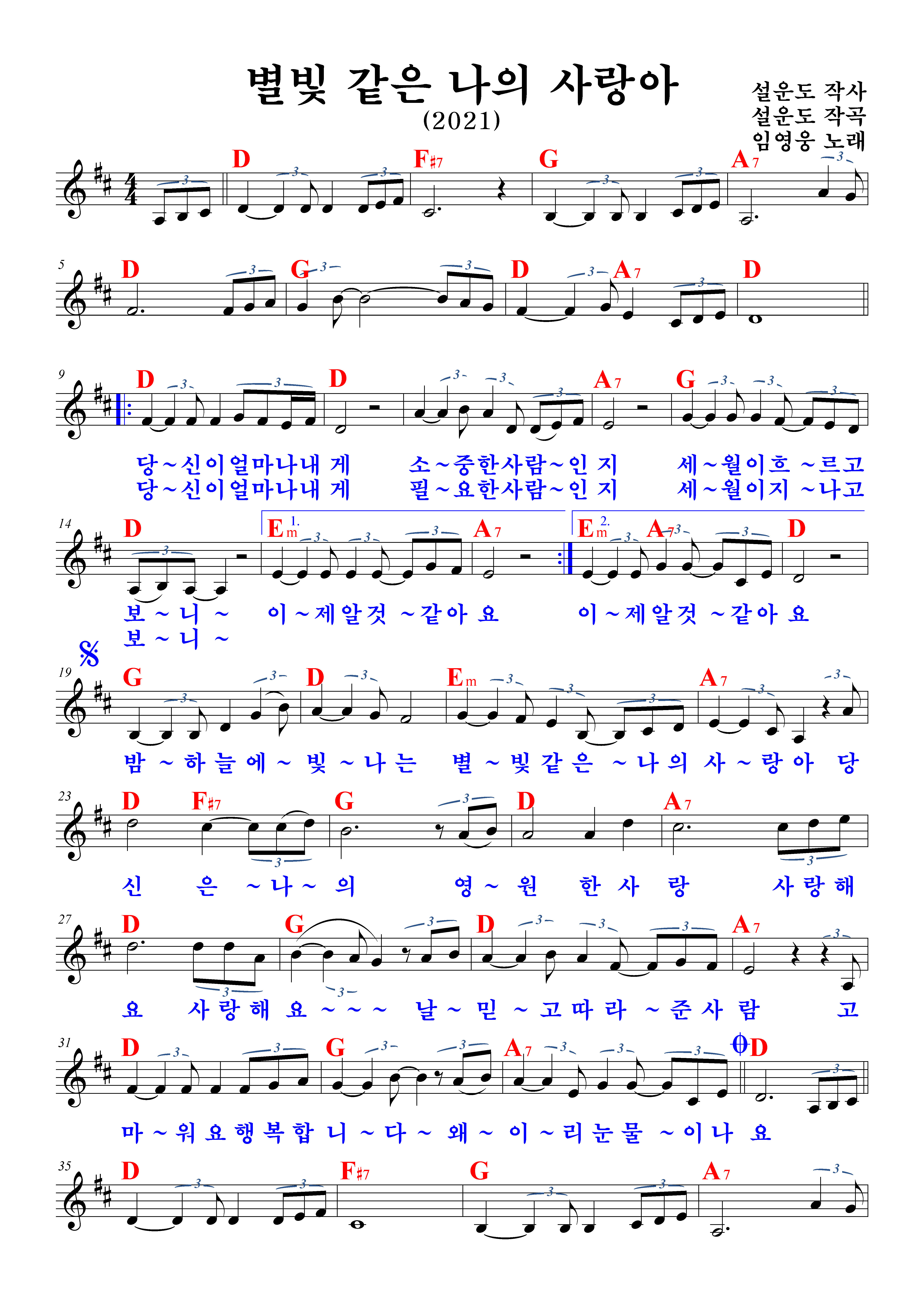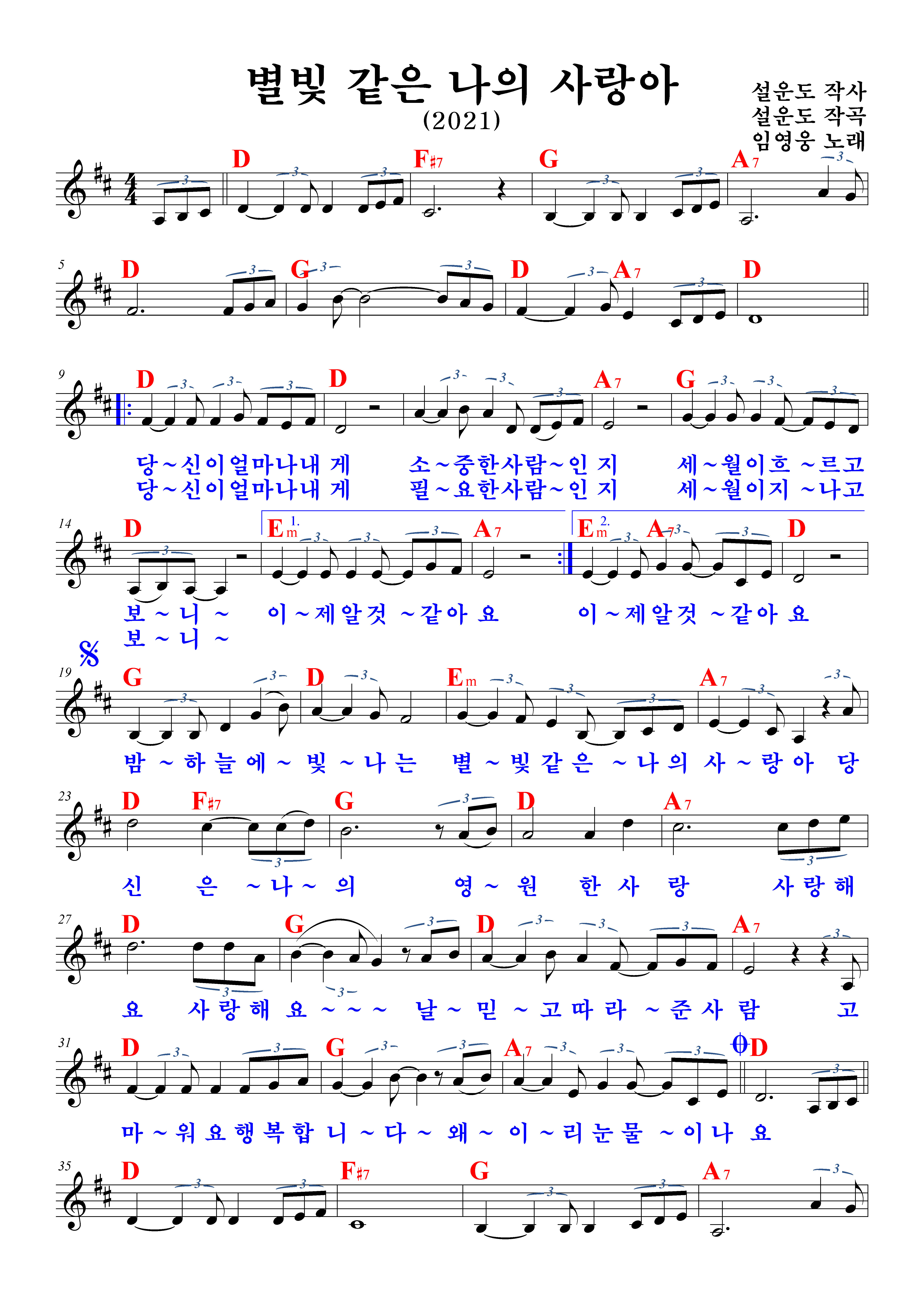 | 당신이 얼마나 내게 소중한 사람인지 세월이 흐르고 보니 이제 알 것 같아요 당신이 얼마나 내게 필요한 사람인지 세월이 지나고 보니 이제 알 것 같아요 밤하늘에 빛나는 별빛 같은 나의 사랑아 당신은 나의 영원한 사랑 사랑해요 사랑해요 날 믿고 따라준 사람 고마워요 행복합니다 왜 이리 눈물이 나요 * 밤하늘에 빛나는 별빛 같은 나의 사랑아 당신은 나의 영원한 사랑 사랑해요 사랑해요 날 믿고 따라준 사람 고마워요 행복합니다 왜 이리 눈물이 나요 * 왜 이리 눈물이 나요 |