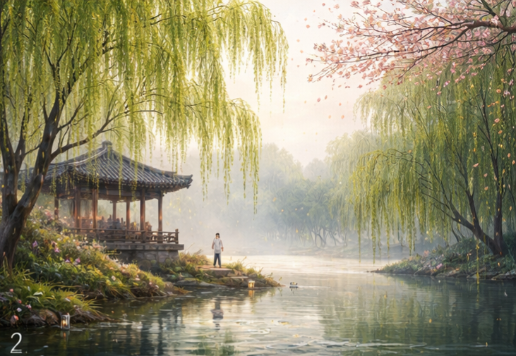 버들은 푸르게 물들고, 바람은 아무 일도 없다는 듯 누각을 스칩니다.