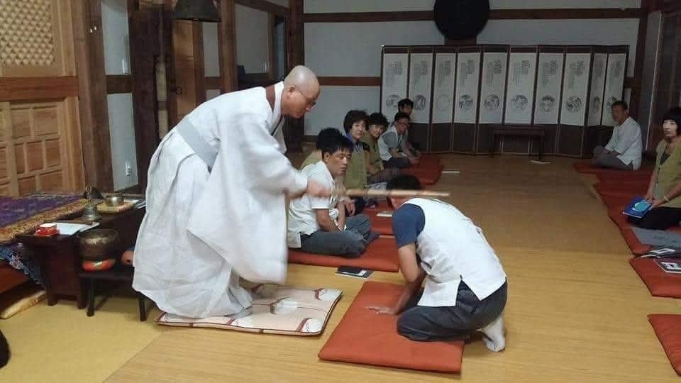 몇사람이 좌선하고 내가 장군죽비로 경책하는 모습을 담고 싶다고 한다.
