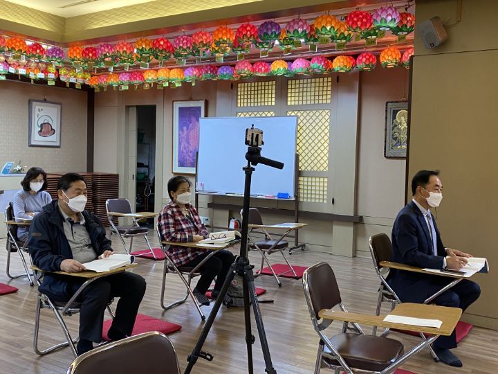 마스크착용.손소독제구비.법회참석자 명단작성.체온측정