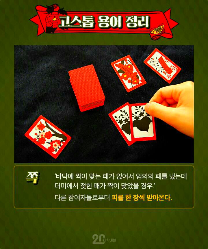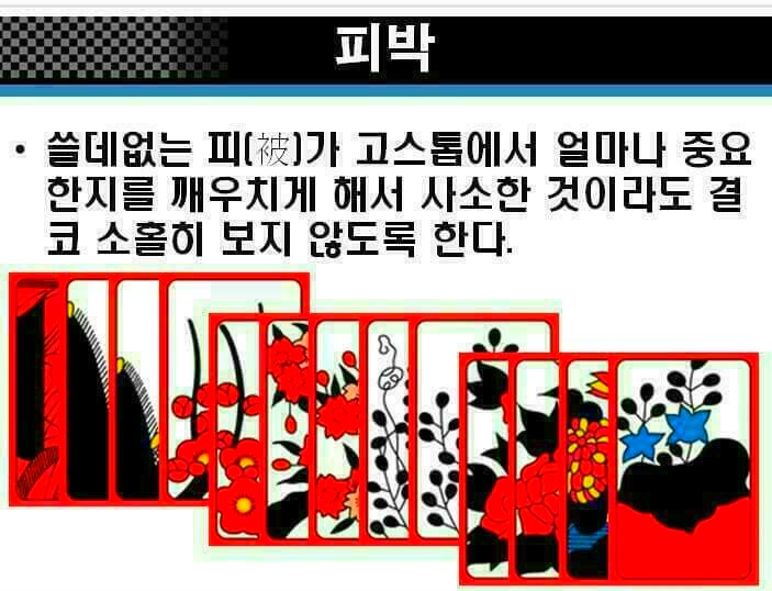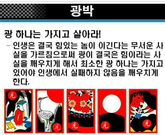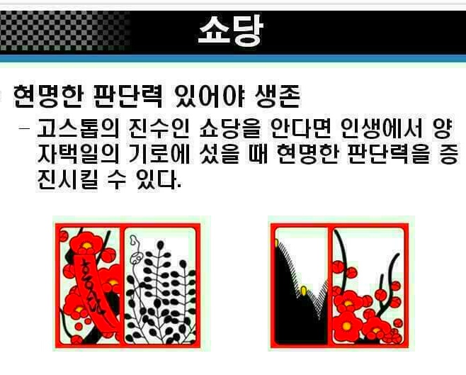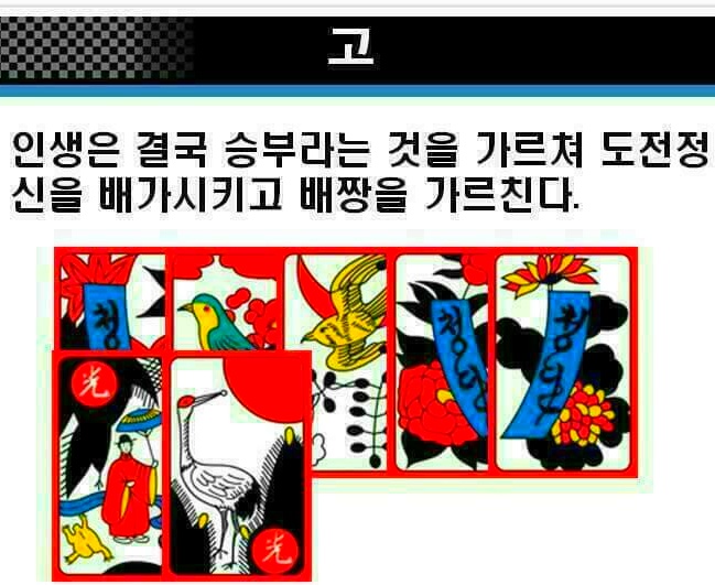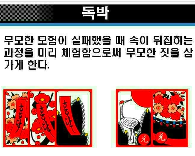 작성자경운아48작성시간19.12.30조회수5,747 목록 댓글 2화투치기 고스톱 1999년에 삼성생명공익재단은 한국인의 4.7퍼센트가 도박 중독증에 걸렸다고 발표하였다. 미국(2~4퍼센트)에 견주면 두 배나 되지만, 오스트레일리아(7퍼센트)보다는 낮은 편이다. 그러나 어떤 학자들은 최고 7~9퍼센트(최소 90만~최고 420만) 에 이르는 것으로 추산한다. 이것이 사실이라면, 세계에서 가장 높은 편에 속하는 것이다. 중독자 수가 근래 급증한 것은 정부가 경마 · 경륜 · 카지노 등 도박을 장려한 결과이기도 하다. 경마 중독이 가장 많고, 카지노도 20퍼센트쯤 되는 것이 그 증거이다. 한가지 우스운 것은 카지노 본거지인 강원랜드에서 도박중독센터를 운영하는 점이다. “병 주고 약 준다.” 는 속담 그대로이다. 앞의 세 가지 외에 가장 많은 비중을 차지하는 것은, 두 말할 것도 없이 화투 도박증이다. 우리 국민 가운데 화투를 치기 위해 태어난 듯한 사람이 적지 않기 때문이다. 심지어 비행기 안에서까지 주저앉아 화투짝을 돌리는 형편이니 말이다. 농촌의 부녀자들도 비닐하우스 따위로 몰려다니며, 수 억 원대의 판을 벌이는 것이 오늘의 현실이다. 옛적에도 뿌리가 깊었다. 짝의 그림을 월별에 따라 풀이한 전라북도 고창지방의 화투타령이 좋은 보기이다. 화투타령 정월 송악에 백학이 울고 삼월 사구라(벚꽃의 일본말) 북치는 소리