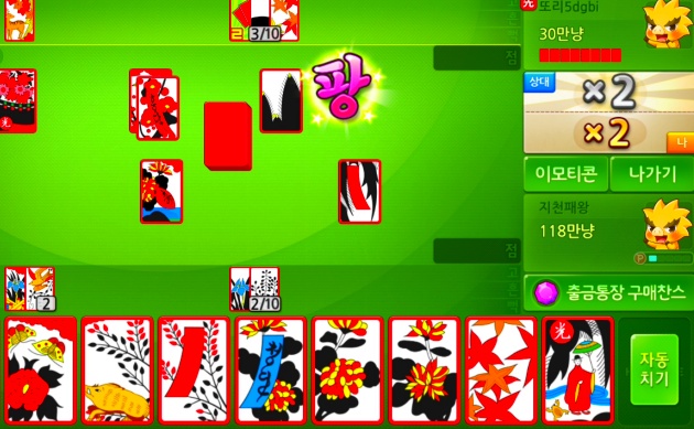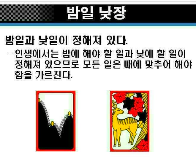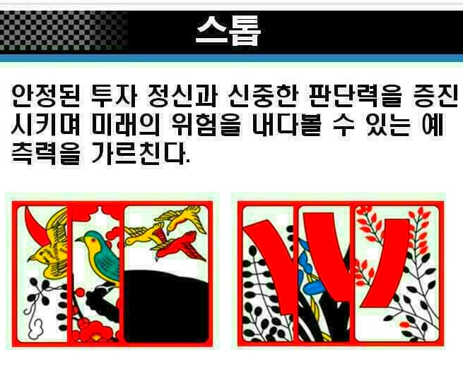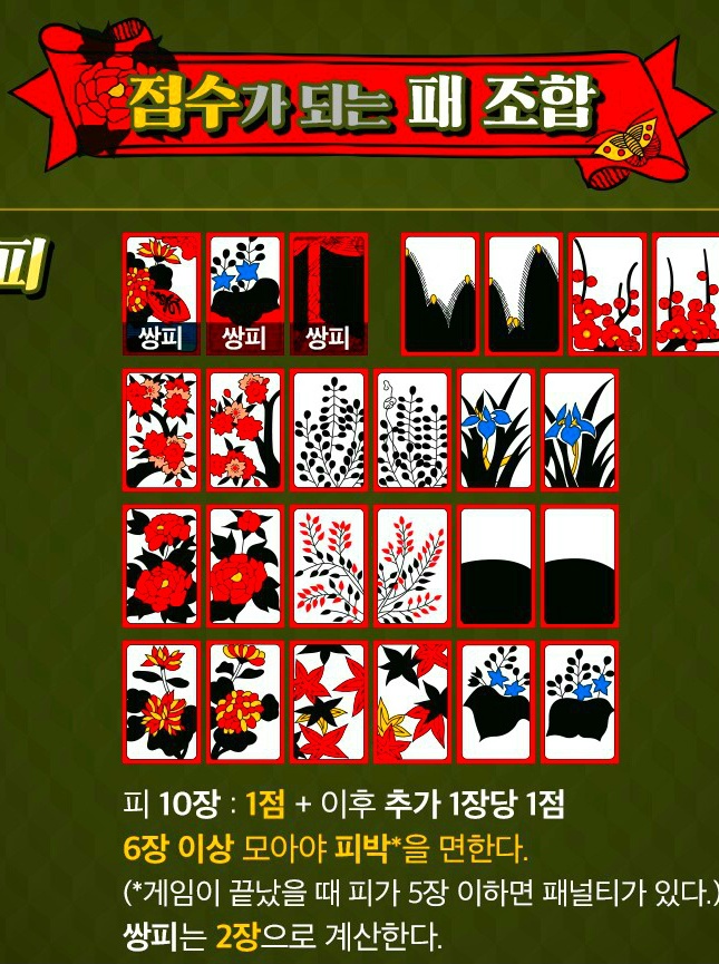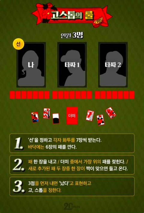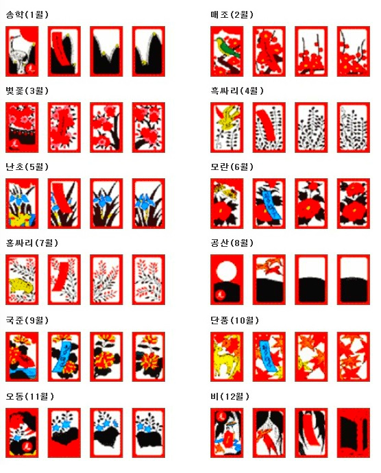 민화투(늘화투) · 600점을 따면 이기는 육백 · 삼봉 · 짓고 땡 · 섰다 등 여러 방법이 있다. 화투놀이는 제게도 좋은 패가 들어와야 하지만 남의 패를 추리해가며 노는 까닭에, 고도의 지능이 필요하고 심리작전도 큰 효과를 낸다. 보잘것없는 끗 수를 가지고, 좋은 패를 가진 남을 이기는 것이 그것이다. 화투는 19세기 말에서 20세기 초에 일본에서 들어왔다. 1926년에 나온 『조선도박요람 (朝鮮賭博要覽)』의 “지금부터 약 30년 전후 내지(일본)에서 (화투류) 를 조선에 수출하여 …(중략)… 내지의 화투를 쓴 박희(博戱)가 성행되었다.”고 적혔다. 일본에서 1909년에 60만 벌, 그 이듬해에 86만 벌, 1911년에 120만 벌을 수출하였으며, 1900년대 초의 5년 동안 모두 376만 벌을 해외에 풀어먹였다. 이 기간의 총생산량이 312만 벌이었으므로, 수출 쪽이 54만 벌이나 더 많은 것이다. 마스가와 고우이치는 “화투의 주 수출국은 조선이라고 판단 해도 틀림없다.”고 하였다. 안녕하세요! 올한해 고마웠습니다 참좋은 사람들과 함께 인생을 살아간다는 것은 참 행복한 일인것 같습니다. 열심히 달려온 한해가 당신과 함께한 올 한해 즐거웠고, 한순간