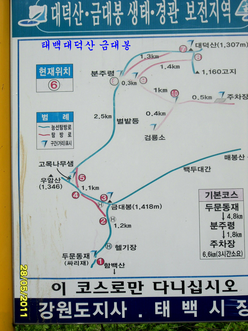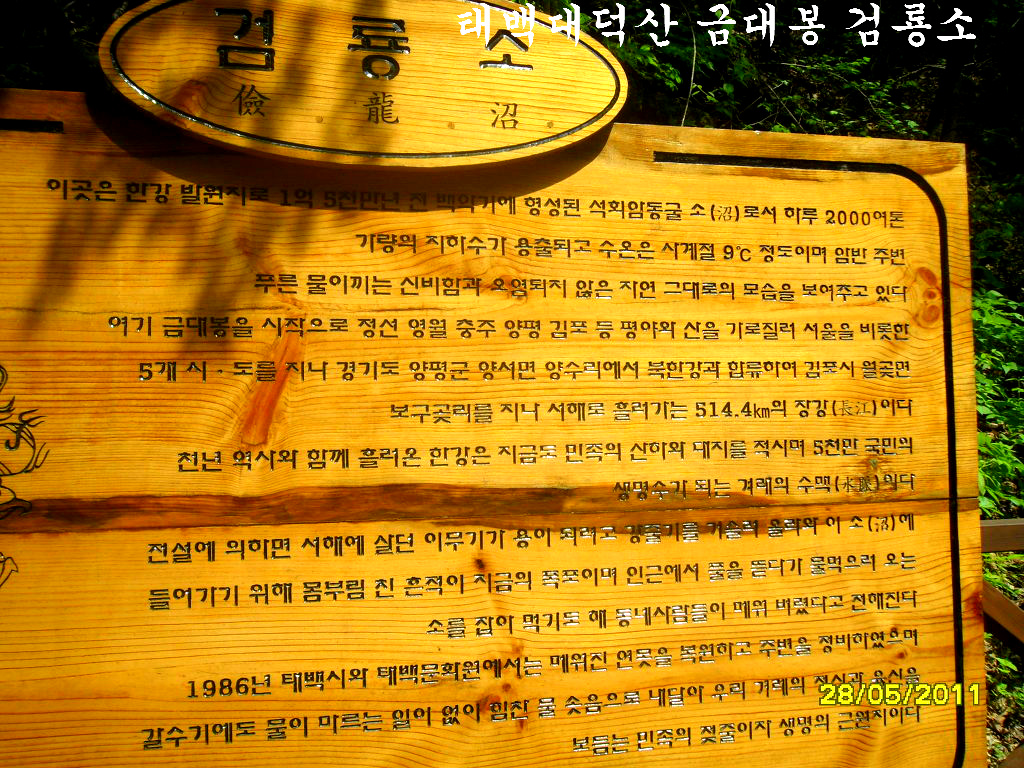 대덕산 1,307m금대봉 1418m태백 검룡소생태계보존지역大德山金臺峰生態系保存地域 강원도 태백시 창죽동, 강원도 삼척시 하장면 강원도 태백시와 삼척시에 걸쳐 있는 금대봉과 대덕산 일대의 생태계 보호지역. 동쪽은 매봉산(1,303m), 남쪽은 함백산(1,573m), 북쪽은 대덕산(1,307m)으로 둘러싸인 면적 약 38만 950㎡의 지역를 1993년 환경부가 강원도 생태계 보전지역으로 지정하였다 높이는 1,307m로, 태백산맥의 줄기인 중앙산맥에 속하는 산이다. 서쪽에 노목산(櫓木山, 1,150m), 남쪽에 금대산(金臺山, 1,096m)· 함백산(咸白山, 1,573m), 동쪽에 육백산(六百山, 1,244m) 등이 솟아 있다. 대덕산은 함백산(1573m)과 더불어 태백산 등 1400m 이상 고산에 둘러싸여 산세가 웅장하다. 대한민국 에서 자동차로 올라갈 수 있는 가장 높은 고개인 만항재(1330m)와 태백선수촌 중간쯤에서 함백산 정상 까지 2.3km로 자동차로 올라갈 수 있다. 그러나 한겨울에는 제설이 안 될 때가 있으므로 산행은 준비를 철저히 하여 가볍게 걷는 게 안전하다. 정상에 서면 백두대간이 그림처럼 펼쳐지고 멀리 동해바다 해돋이도 한눈에 들어온다. 태백 검룡소 강원도 태백시 창죽동에 있는 명승 태백 검룡소는 금대봉 기슭에 위치한 검룡소와 그 주변에 특이한 경관을 이루는 계곡을 대상으로 2010년에 명승 제73호로 지정되었다 검룡소는 금대봉 기슭의 제당굼샘· 고목나무 샘· 물골의 석간수· 예터굼에서 솟아난 물이 지하로 스며들었다가 이곳에서 다시 솟아나 한강의 발원지를 이루는 곳이다. 검룡소에서 석회암반을 뚫고 나온 지하수는 용틀임하듯이 계곡을 흘러내리며, 20m 이상의 계단상 폭포를 이루고 있다. 이곳은 하루 2천 톤 가량의 지하수가 솟아나오는 냉천(冷泉)으로 사계절 9℃ 정도의 수온을 유지한다. 전설에 의하면 옛날 서해 바다에 살던 이무기가 용이 되고자 한강을 거슬러 올라와 가장 먼 쪽의 상류 연못을 찾아 헤매었다. 이무기는 가장 먼 상류의 연못이 이곳임을 확인하고 들어갔는데, 용틀임하는 것처럼 암반이 파인 것은 이무기가 연못으로 들어가기 위해 몸부림 친 자국이라고 전한다. 한강의 발원지는 오랜 세월 강원도 평창군 오대산 우통수로 알려져 왔으나, 지도상의 거리를 측정한 결과 검룡소가 우통수보다 약 27㎞ 상류임이 확인되었다. 검룡소 주위의 암반에는 물이끼가 푸르게 자라고 있어 신비한 모습을 하고 있다. 이곳에서는 매년 8월 첫 번째 일요일에 한강대제가 열린다. |