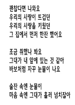 머리를 아프게 하는 것은 술이요, 마음을 아프게 하는 것은 사랑이다. 잠시동안 너를 잊게 하는 것은 술이요, 오랫동안 너를 잊지 못하는 것은 사랑이다. 손을 떨리게 하는 것은 술이요, 가슴을 떨리게 하는 것은 사랑이다. 아무한테나 줄 수 있는 것은 술이요, 한 사람에게 줄 수 있는 건 사랑이다. 뱃속을 채우는 것은 술이요, 영혼을 채우는 것은 사랑이다. 깊은 잠으로 빠져 들게 하는 것은 술이요, 깊은밤 잠 못이루게 하는 것은 사랑이다. 내 마음대로 마시는 것은 술이요, 나의 뜻대로 안 되는 것은 사랑이다. 자유롭고 싶은 것은 술이요, 구속하고 싶은 것은 사랑이다. 늘 곁에 둘 수 있는 것은 술이요, 붙잡아도 떠나는 것은 사랑이다. 사랑을 더 뜨겁게 만드는 것은 술이요, 술을 더욱 달콤하게 만드는 것은 사랑이다. 비가 오면 생각나는 것은 술이요, 눈이 오면 생각 나는 것은 사랑이다. 자고나면 보기 싫은 것은 술이요, 자기 전에 생각나는 것은 사랑이다 예술이야ㅡ =cafeapp 노래 이야기ㅡ 문득 차오르는 첫사랑의 기억ㅡ =cafeapp 내몸에꼭맞는ㅡ