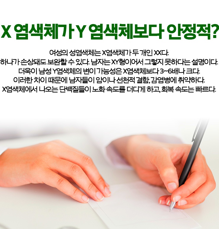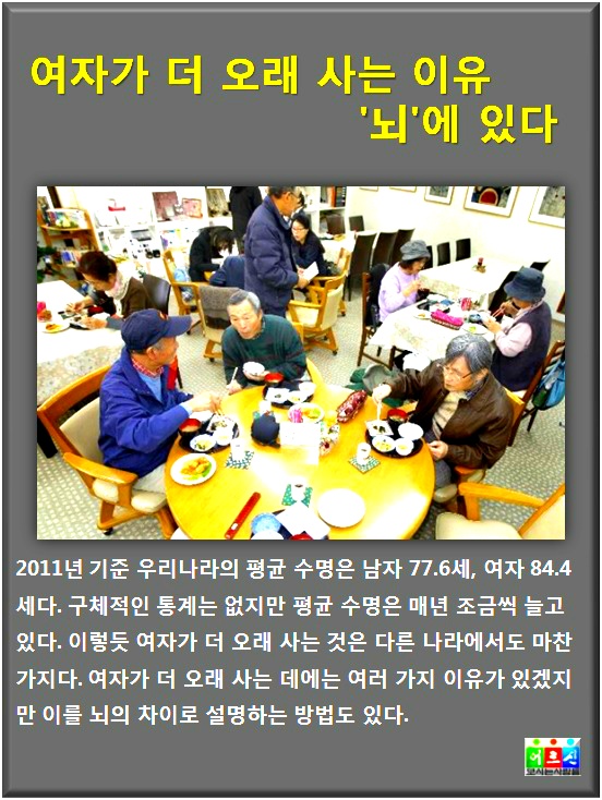 작성자경운아48작성시간20.01.12조회수6,053 목록 댓글 1여자가 오래 사는 이유 남녀의 뇌차이 남자보다 여자가 일반적으로 더 오래 사는 것으로 통계에 나와 있는데 (한국 평균수명 : 남자 75세, 여자 82세, 일본 평균 수명: 남자79세, 여자 86세) 이것은 어떤 이유 때문인가? 여러 가지 가능한 이유가 제시되고 있지만 그 중에서도 바로 뇌의 구조와 기능이 일부 다르기 때문이라는 설명이 비교적 설득력 있게 받아들여지고 있다. 우선 염색체의 구성이 남자는 XY, 여자는 XX로 서로 다르다.