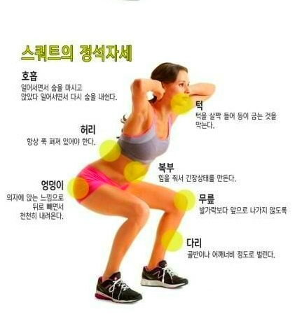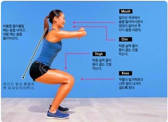 4. 스쿼트, 진짜 좋습니다. 앉았다 일어났다 하는 운동이죠. 꿀벅지와 애플힙을 만들어주는. 우리 몸에서 가장 큰 근육이 엉덩이와 허벅지 근육입니다.