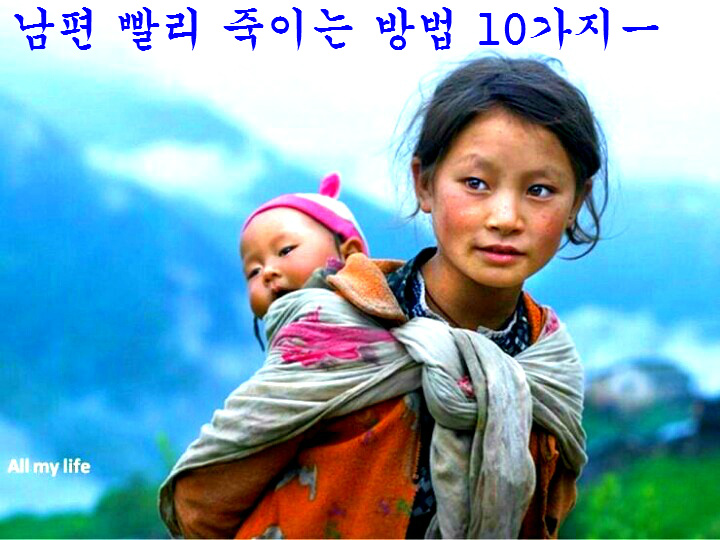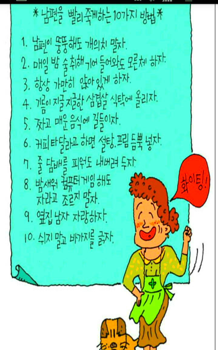 남편 빨리 죽이는 방법 10가지★ 첫 번째 아침에 사랑의도시락과 정성 들여 해장국과밥상을 차려놓는 거예요 일어나면 깜짝 놀래서 두 번째 오늘 뜨거운 물 때문에 열 받아 죽을 수도 있어요 세 번째 " 왜 이렇게 변했냐?"고 물어보면 네 번째 상냥한 엄마로 남편에게 이해심이 많은 사랑스런 아내로 남편은 비위가 다섯 번째