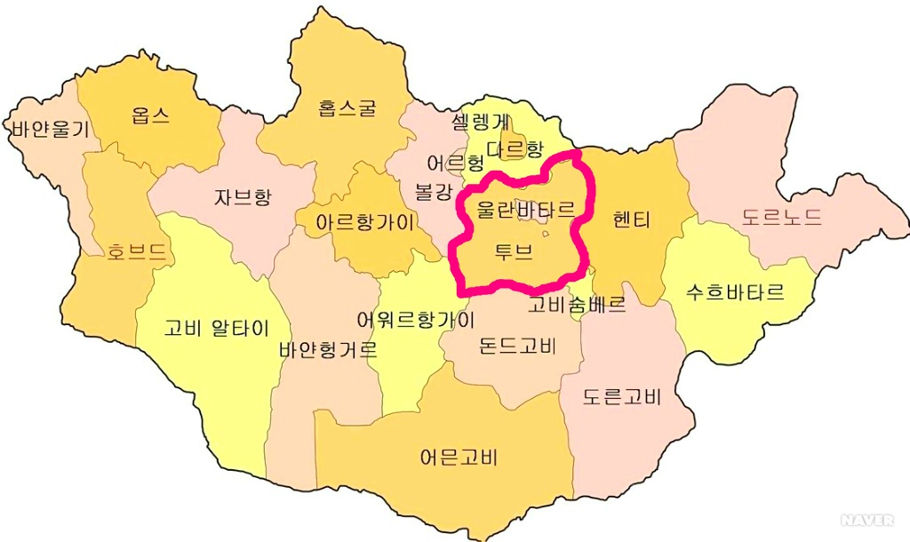 몽골 울란바토르 시 울란바토르Ulan Bator몽골의 수도인 울란바토르는‘붉은 영웅’이란의미를 지니고 있으며,1639년에 건립되었다위도상으로는 파리(Paris), 뮌헨(München), 시애틀(Seattle) 등과 거의 일치하고 경도상으로는 호찌민(Ho Chi Minh), 자카르타(Jakarta) 등과 일치한다. 면적은 1,358㎢로 서울의 2.2배이고, 분지 형태이다. 표고(標高)는 1,350m, 인구는 2011년 3월 기준 124만 명이고, 인구밀도는 195명/㎢이다. 행정구역은 9개 구(district)로 나누어진다. 이를 구체적으로 살펴보면 칭겔테(Chinggeltei), 수흐바토르(Sühbaatar), 바양주르흐(Bayanzurkh), 바양골(Bayangol), 항올(Khan-Uul), 성긴하이르한 (Songinkhairkhan), 날나이흐(Nalaikh), 바가누르(Baganuur), 박항가이(Bagakhangai) 등이다. 기후는 저온 건조한 대륙성 냉 대기후로 4계절이 분명하다. 평균 강수량은 242.7㎜이고 평균 습도는 69%이다. 연평균 기온은 2.2℃로 봄(3월~5월)에는 황사가 심하며 평균 기온이 영상 5℃이나, 가끔 눈보라가 치며 강풍이 부는 등 변덕이 심하다. 몽골 사람들은 성격이 변덕스러운 사람을 보고 봄 날씨와 같다고 비유한다. 여름(6월~8월)의 평균 기온은 15℃ 정도로 비가 자주 오지만 양은 많지 않으며, 가끔 소나기성 우박이 내린다. 가을(9월~10월)의 평균 기온 7℃ 정도이며 맑은 날씨가 계속되지만 기온이 급격히 내려가는 것이 특징이다. 겨울(11월~2월)에는 강설량은 많지 않으나 눈이 오면 녹지 않아 겨울 내내 흰 눈이 덮혀 있다 한겨울 낮 기온은 영하 20℃이고 밤 기온은 영하 40℃ 이하까지 떨어지는 경우도 있다. 호텔 호텔 가운데 선진그랜드 호텔(한국인 설립), 칭기즈칸 호텔, 울란바토르 호텔, 코퍼리트 호텔, 바양골 호텔, 캠핀스키 호텔 등의 시설이 비교적 양호하다. 호텔에서는 여행자수표와 신용카드를 사용할 수 있다. 치안 (Ulan Bator) 시내에 강도와 절도가 증가하는 추세이다. 백화점, 시장, 거리에서 외국인을 노리는 소매치기들이 많다. 주로 야간에 강도와 절도가 증가하므로 주의가 필요하다. 교통수단 주요 교통수단은 버스, 전차, 택시 등이다. 대기오염 공해의 대부분은 유연탄을 사용하는 게르촌에서 나오는 매연 시내에 있는 세 개의 열병합 화력발전소 (시 전체에 난방 공급) 및 자동차 배기가스 등에서 비롯된다. 울란바토르 시는 분지이기 때문에 바람이 없는 겨울에는 스모그로 인해 거의 매일같이 전 시가지의 시계가 50m 내외로 악화된다. 이로 인해 유아 사망률, 천식, 기관지염 등 각종 호흡기 질환, 기형아 출생 및 불임 등이 증가하고 있다. 울란바토르의 주요 관광지는 다음과 같이 살펴볼 수 있다. Terelj National Park) 2) 자이산 승전탑 (Zaisan Memorial) 자이산 승전탑은 1939년 몽골과 소련 연합군과 일본군 간의 할흐(Khalkh) 강 전투에서의 승리와 제2차 세계대전에 참전한 구소련군을 기념하기 위해 1945년 조성된 기념탑으로 울란바토르 (Ulan Bator) 시내 전경과 톨(Tuul) 강 주변 자연경관을 볼 수 있으며, 야간 울란바토르 시 야경을 즐길 수 있다. 자이산 승전탑에는 할흐 강 전투 시 일본군을 격퇴한 내용의 조형물이 있다. 시내 남쪽에 위치, 정부 청사에서 차량으로 10분 거리이다 3) 이태준 기념공원 대암 이태준 선생 (1883년~1921년)은 1914년 몽골에 입국, ‘동의의국’이라는 병원 개업후 몽골인들에게 근대적 의술을 베풀면서 각지의 애국지사들과 연계하여 항일 활동을 전개하였다 이태준 선생은 1921년 울란바토르(Ulan Bator)를 점령한 러시아 백군 운게른의 부하들에 의해 교살되었다. 2000년 7월 7일 이태준 선생의 업적을 기념하여, 재몽골한인회와 연세 의료원이 주축이 되어 ‘이태준 기념공원’을 건립하였다. 이태준 기념공원은 울란바토르 시 복드칸(Bogd Khan) 산 남쪽 기슭 자이승 승전탑 아래에 위치하고 있다. 4) 몽골 국립박물관 국립박물관은 인류 거주 시기인 75만 년 전부터 현대까지 몽골 지역에서 출토된 5만여 점 이상의 역사 유물을 기초로 고대국가, 몽골제국, 몽골 전통문화 및 생활상, 전통 의복 및 복식 등 몽골의 고대에서 근현대까지의 발전 과정을 전시하고 있다 1924년 자연박물관으로 설립되었으며, 1971년 현재의 건물로 이전하였다. 1992년 자연박물관의 개편으로 자연사박물관과 국립역사박물관으로 각각 분리 독립하였다. 국립역사박물관은 2008년 12월 국립박물관으로 개칭하였다. 정부 청사 서쪽에서 도보 5분 거리에 위치하고 있다 (Zanabazar Museum of Fine Arts) 자나바자르 불교미술박물관은 17세기 몽골 라마불교의 생불이었던 자나바자르 (Zanabazar)의 업적과 불교예술 작품을 감상할 수 있는 박물관이다. 정부 청사 서쪽에서 차량 5분 거리에 위치하고 있다. 6) 복드칸 궁전 박물관 (Winter Palace of Bogd Khan) 외몽골의 독립 선언 후 수립된 새 정권은 티베트 출신의 제8대