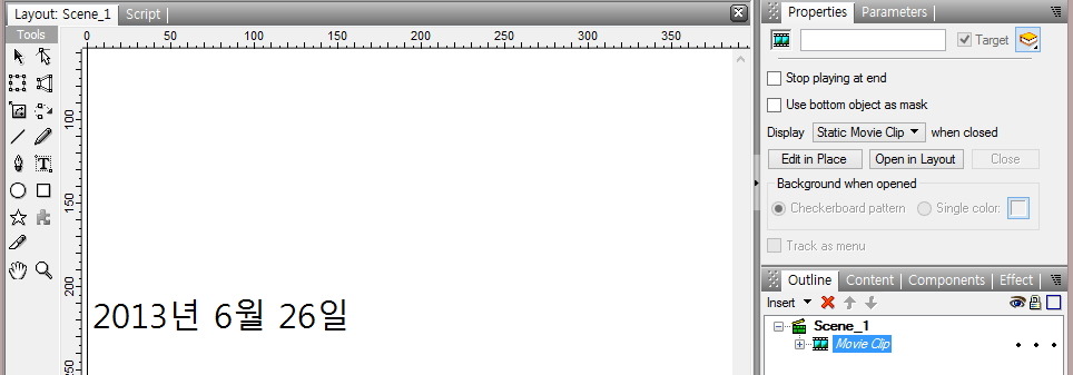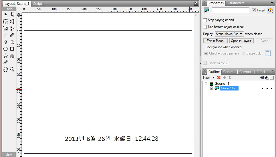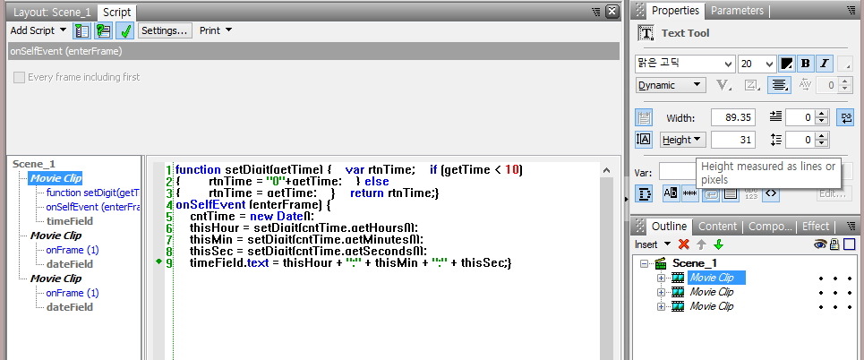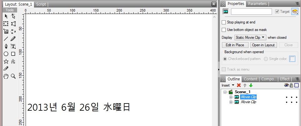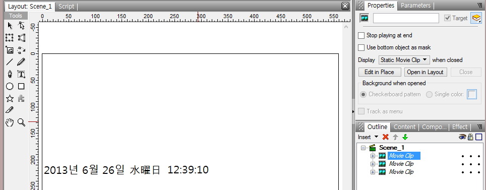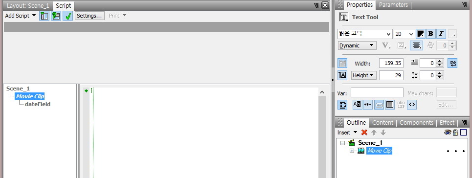 ⑪ 다음은 같은 방법으로 Outline Panel에서 [Movie Clip]을 [dateField]로 이름을 변경하여,
