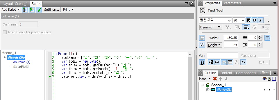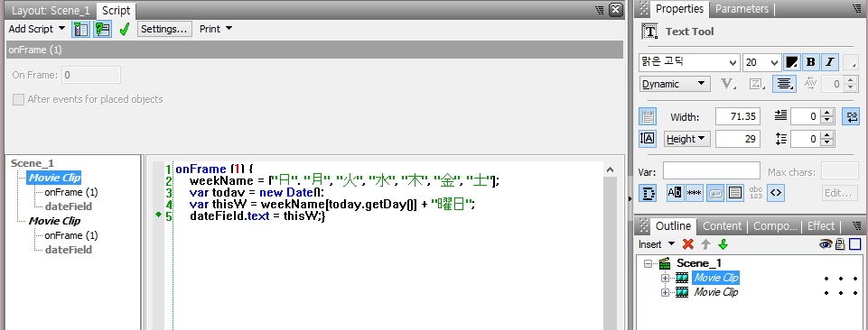 이 새로 생긴 [Movie Clip]을 잡고, [Script]창을 열고, PC에 저장해둔 요일소스를 복사해 와서