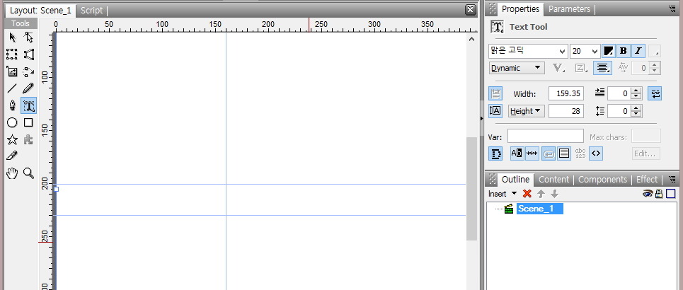 ⑤ Stage에서 가로 작업선을 따라서 글틀을 Drag하여 그립니다.