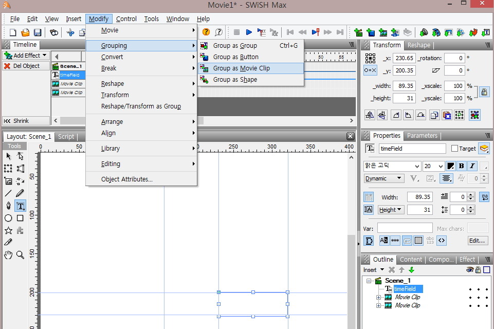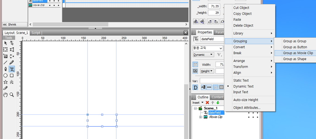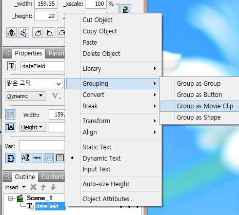 [Grouping]→[Group as Movie Clip]을 순서대로 크릭합니다.