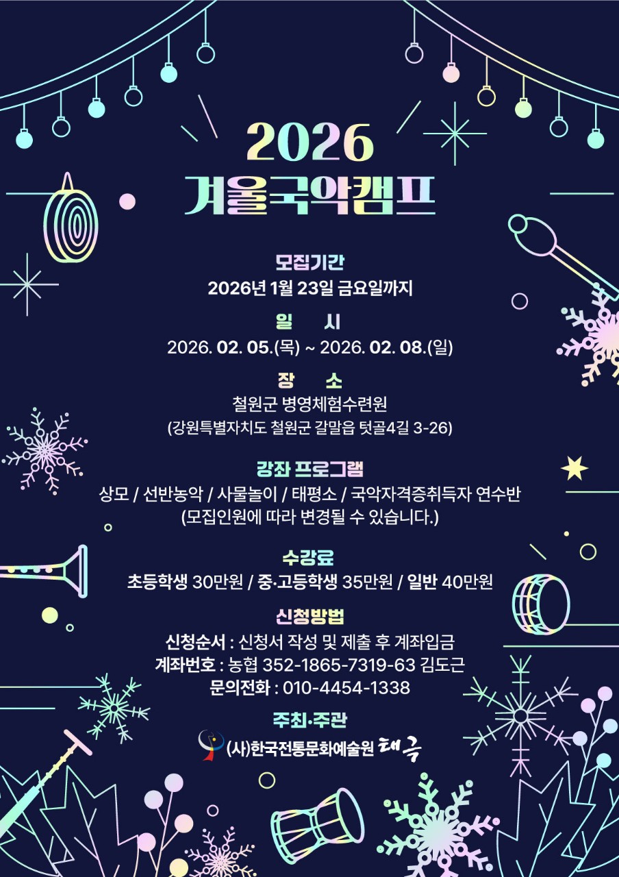 [태극문화기획부] (사)한국전통문화예술원 태극이 다가오는 2026년 겨울, 우리 소리의 멋과 흥을 체험할 수 있는 '2026 겨울국악캠프'를 개최한다.