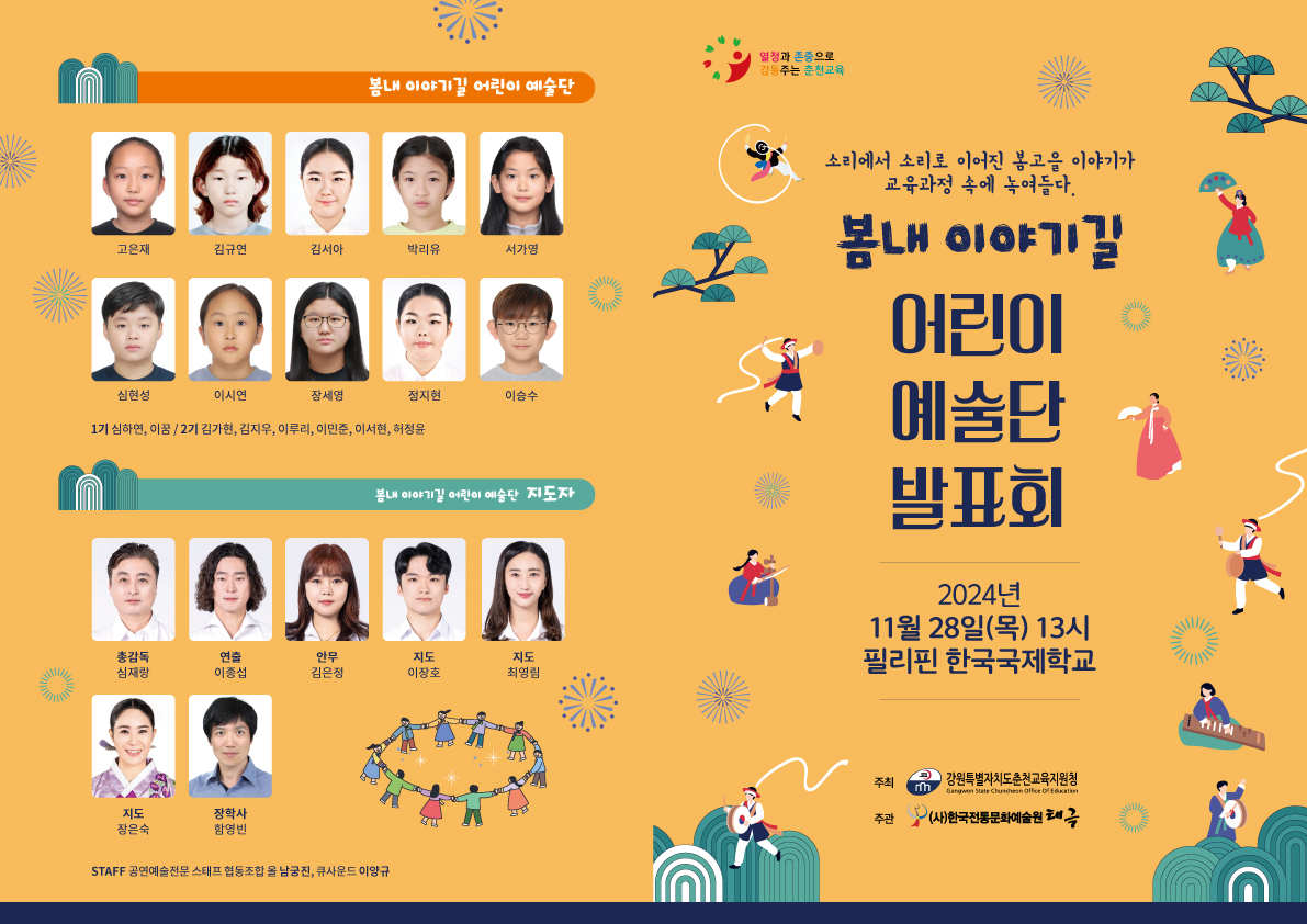 2024 봄내 소리예술단 국제교류 공연을 성황리에 잘 마무리 하였습니다. 이번 공연을 통해 아이들과 함께 저 또한 많은 것을 느끼고 배우는 자리였습니다. 항상 꿈을 위해 노력하는 아이들을 보며 뿌듯함과 책임감을 다시 한 번 느끼는 공연 이였습니다.우리음악의 미래를 책임지고 가야 할 봄내소리 예술단 친구들에게 아낌없는 사랑과 응원 부탁 드립니다.