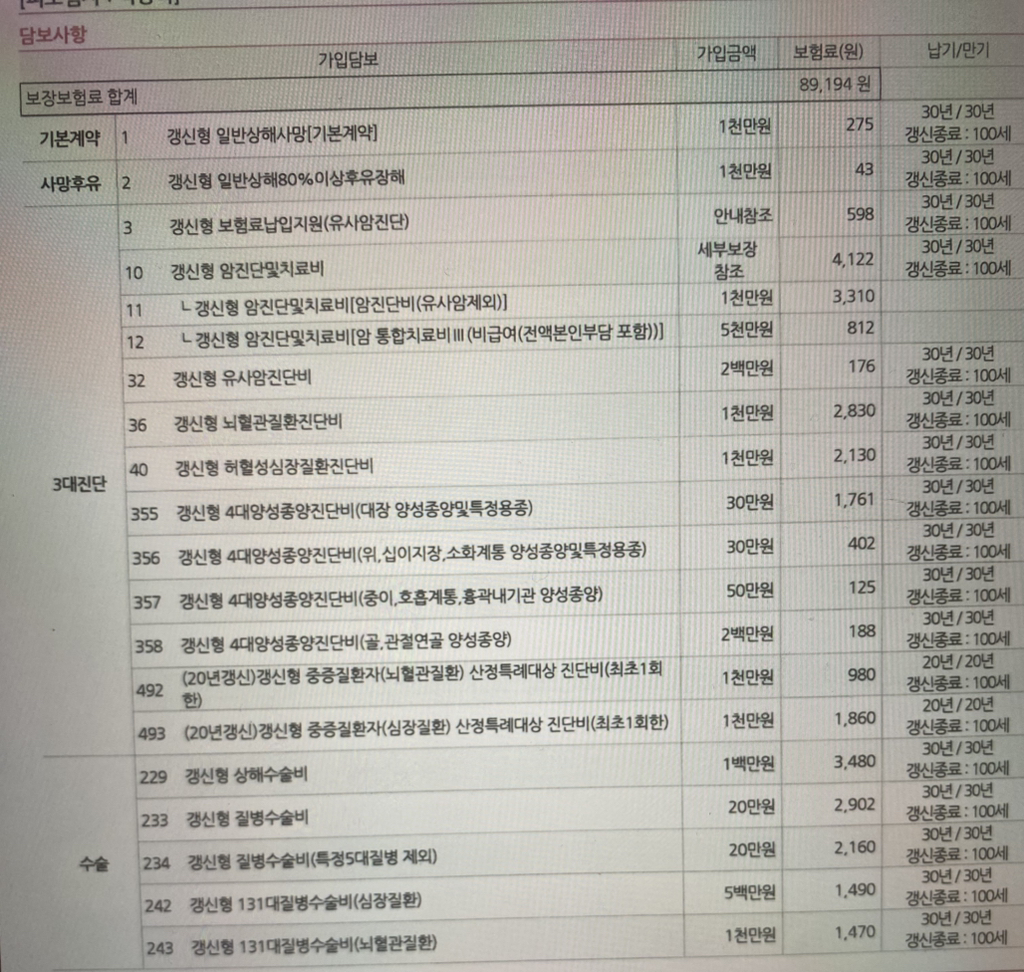 보장도 암 5,000만원, 뇌, 심장 2,000만원을 진단비로 설정하시고