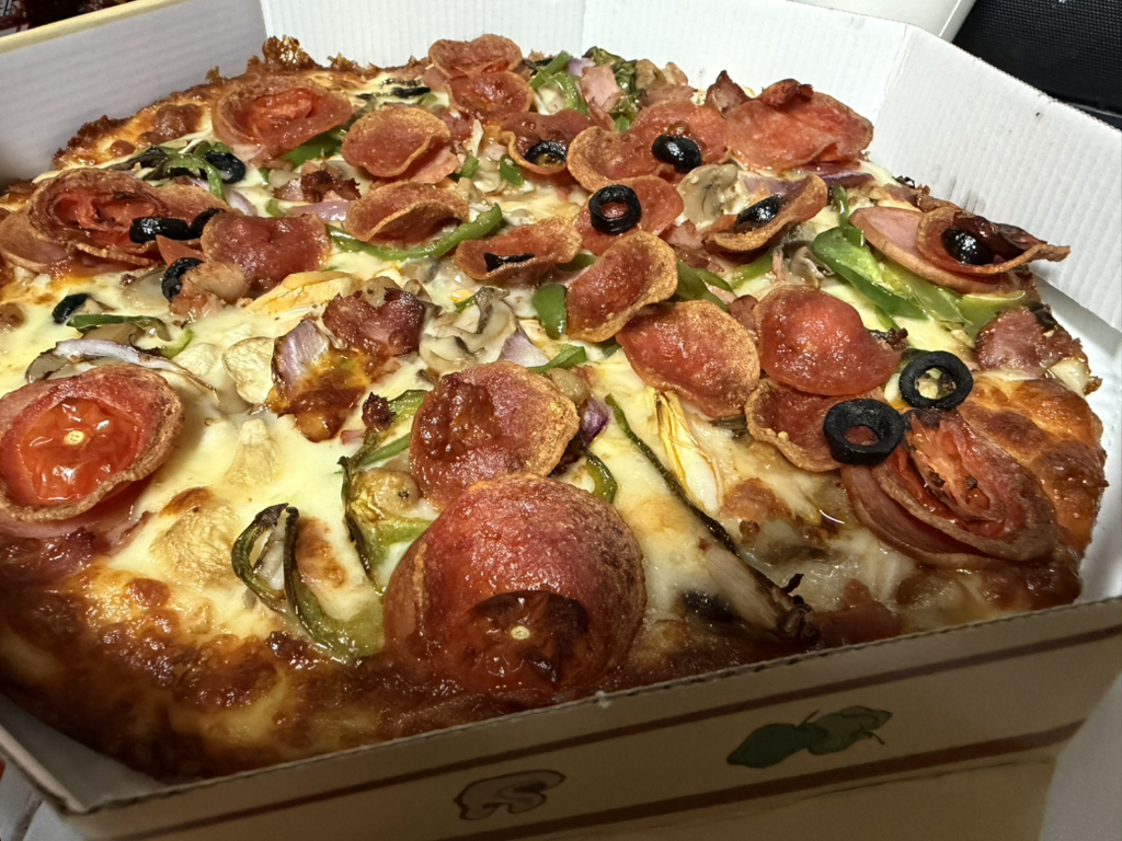 페퍼로니,치즈,토마토,올리브,초록피망,양파,버섯,베이컨이 들어가 있는거 같아요. 햄과 베이컨에 들어간 단백질.. 토마토,올리브, 초록피망, 양파, 버섯에 들어간 섬유질/비타민... 치즈에 들어간 풍부한 칼슘과 지방 거기다 비타민함유.. 그리고 발효식품이라 장건강에도 좋죠.