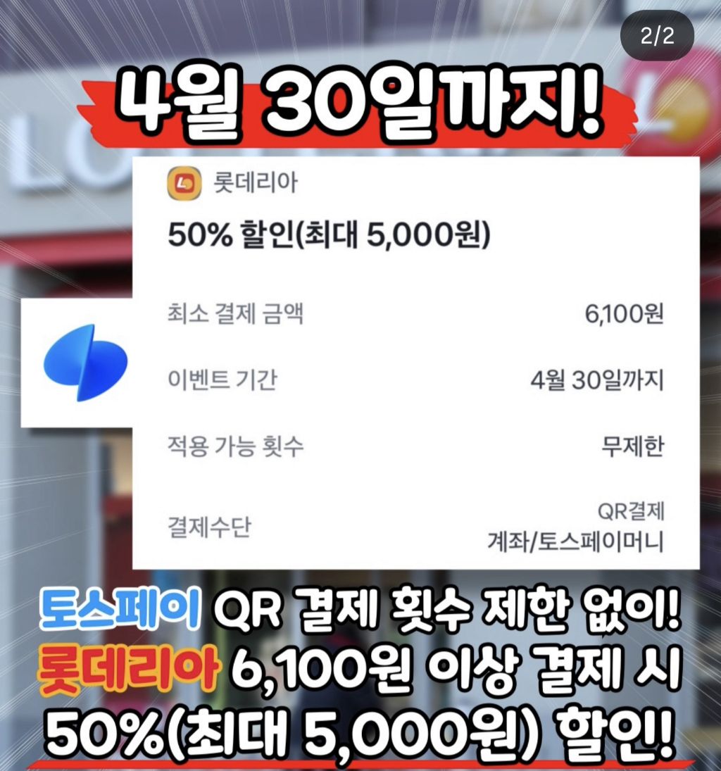 오 토스페이로 롯데리아 50프로 할인받음 개꿀 작성자카리나Kirina|작성시간26.04.04|조회수297 목록 댓글 1 글자크기 작게가 글자크기 크게가 토스페이로 충전해서 했는데 진짜 50프로 할인됨 개꿀 다음검색 현재 게시글 추가 기능 열기 북마크 공유하기 신고 센터로 신고 댓글 댓글 1 댓글쓰기 답글쓰기 댓글 리스트 작성자Moonrise💙 | 작성시간 26.04.04 아 어제 시켜먹었는데 ㅜㅜ 2주뒤에 해야지 ㅎㅎ 댓글 전체보기