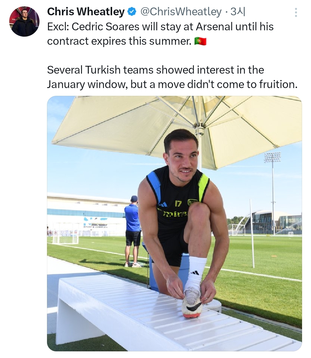 [SNS][크리스 휘틀리 독점 外] 세드리크 올 여름까지 잔류 작성자BBC Sport|작성시간24.02.01|조회수233 목록 댓글 1 글자크기 작게가 글자크기 크게가 세드리크 소아르스는 계약이 만료되는 올 여름까지 아스날에 잔류할 것이다. 여러 튀르키예 팀들이 겨울 이적시장에서 관심을 보였지만 이적은 결실을 맺지 못했다.X의 Chris Wheatley님(@ChrisWheatley)Excl: Cedric Soares will stay at Arsenal until his contract expires this summer. 🇵🇹 Several Turkish teams showed interest in the January window, but a move didn't come to fruition.twitter.comLIVE Transfer Deadline Day: Chelsea's Broja could leaveThe 2024 winter transfer window will close on Feb. 1 across Europe -- 11 p.m. GMT/6 p.m. ET for the Premier League. Here's all the latest gossip and news.www.espn.co.uk 다음검색 현재 게시글 추가 기능 열기 북마크 공유하기 신고 센터로 신고 댓글 댓글 1 댓글쓰기 답글쓰기 댓글 리스트 작성자바이언2 | 작성시간 24.02.01 댓글 전체보기
