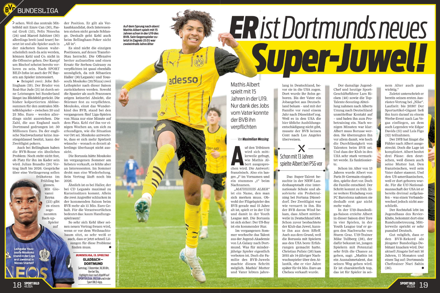 BVB 윙어인 마티스 알버트는 이제 겨우 15살이지만, 19세 이하 유스 리그에서 뛰고 있다. 보루시아는 이 미국 소년은 떠오르는 스타라고 확신한다.