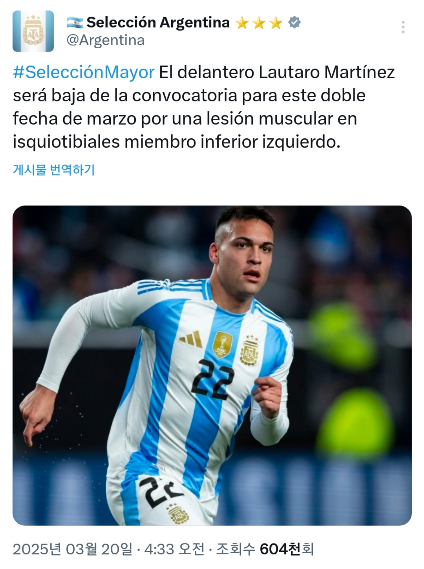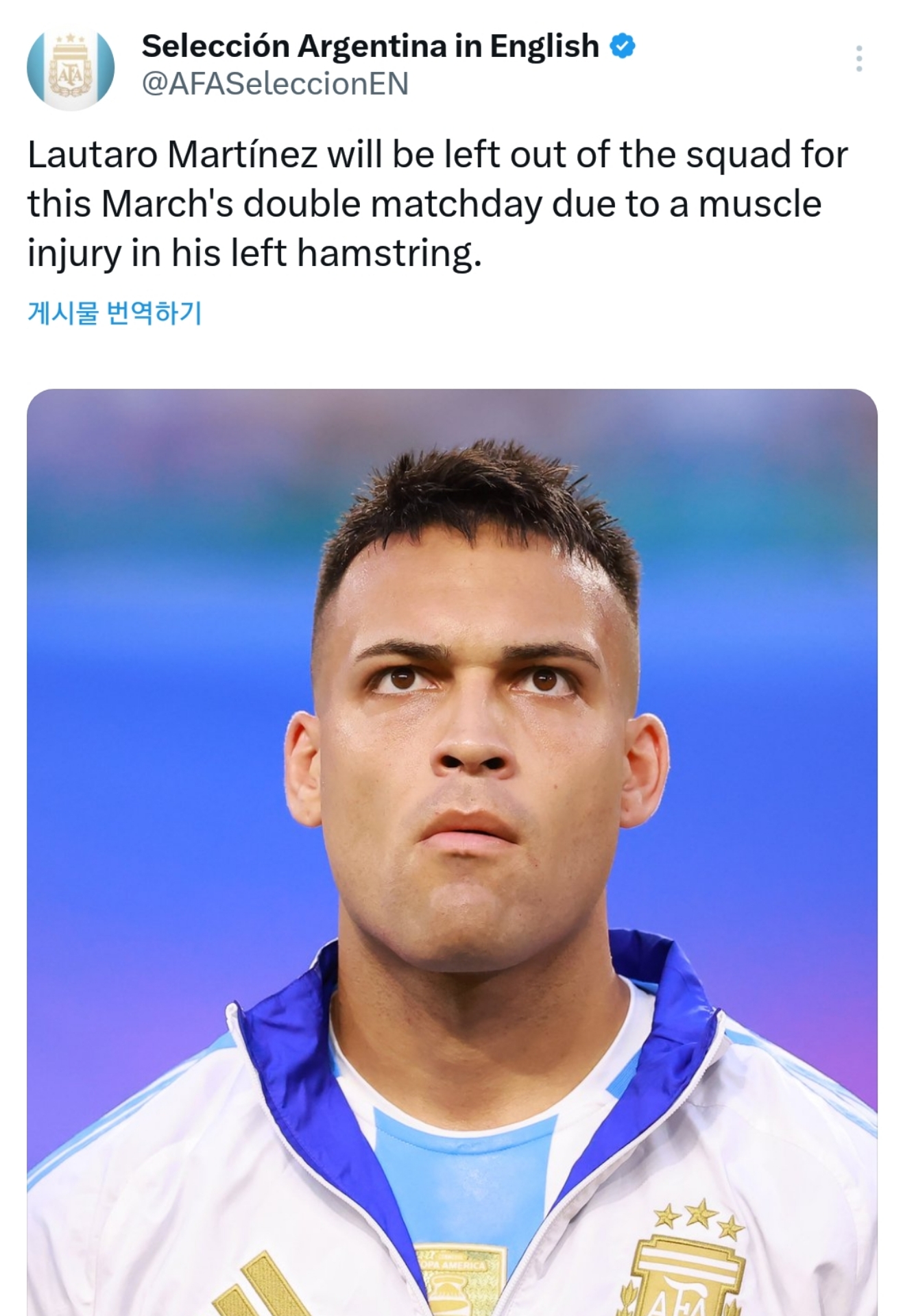 [오피셜]라우타로 마르티네스, 왼쪽 햄스트링 근육 부상으로 인해 이번 3월 A매치 명단에서 제외됨 작성자리오넬 메갓지민|작성시간25.03.20|조회수451 목록 댓글 1 글자크기 작게가 글자크기 크게가 https://x.com/Argentina/status/1902443220736541074?t=Gj82_z8QKLugtWL8XTAWQA&s=19https://x.com/AFASeleccionEN/status/1902446248893784556?t=Gj82_z8QKLugtWL8XTAWQA&s=19 다음검색 현재 게시글 추가 기능 열기 북마크 공유하기 신고 센터로 신고 댓글 댓글 1 댓글쓰기 답글쓰기 댓글 리스트 작성자깐징 | 작성시간 25.03.20 에이매치전에 부상소식이 많네 댓글 전체보기