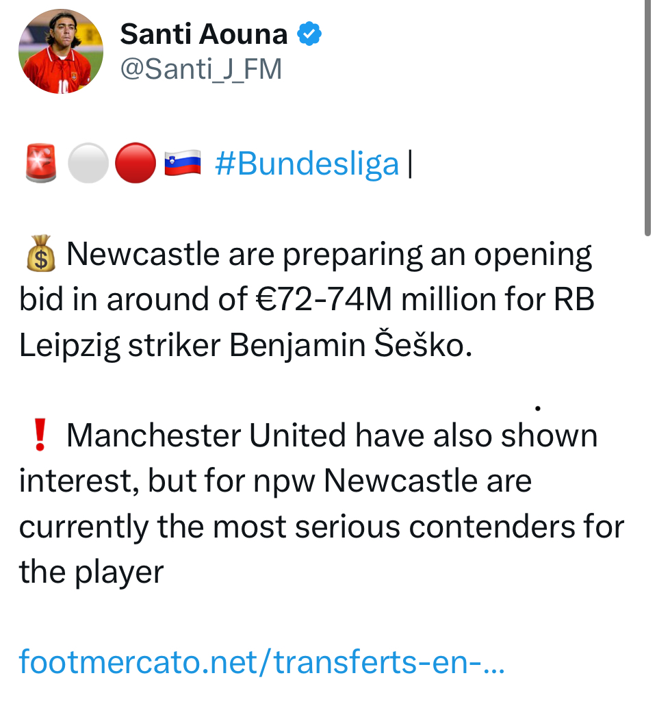 [산티 아우나🌖] 뉴캐슬, 세슈코 영입을 위해 €72-74M 규모의 첫 공식제안 준비 작성자박경섭|작성시간25.07.28|조회수853 목록 댓글 14 글자크기 작게가 글자크기 크게가 맨유도 관심이 있지만, 현재 뉴캐슬이 가장 유력한 행선지임 다음검색 현재 게시글 추가 기능 열기 북마크 공유하기 신고 센터로 신고 댓글 댓글 14 댓글쓰기 답글쓰기 댓글 리스트 답댓글 작성자축구학개론 | 작성시간 25.07.28 안돼 𐨛 ヲ𐌅 𐨛 ヲ 𐌅 𐨛 ヲ 𐌅 𐨛 ヲ 𐌅 𐨛 ヲ 답댓글 작성자스마슈 | 작성시간 25.07.29 ㅋㅋㅋㅋㅋㅋㅋ 작성자이나경 | 작성시간 25.07.28 ㄷㄷㄷ 작성자DE JONG | 작성시간 25.07.28 호일룬한테 데여서.. 작성자우상향 | 작성시간 25.07.28 사지말자 댓글 전체보기