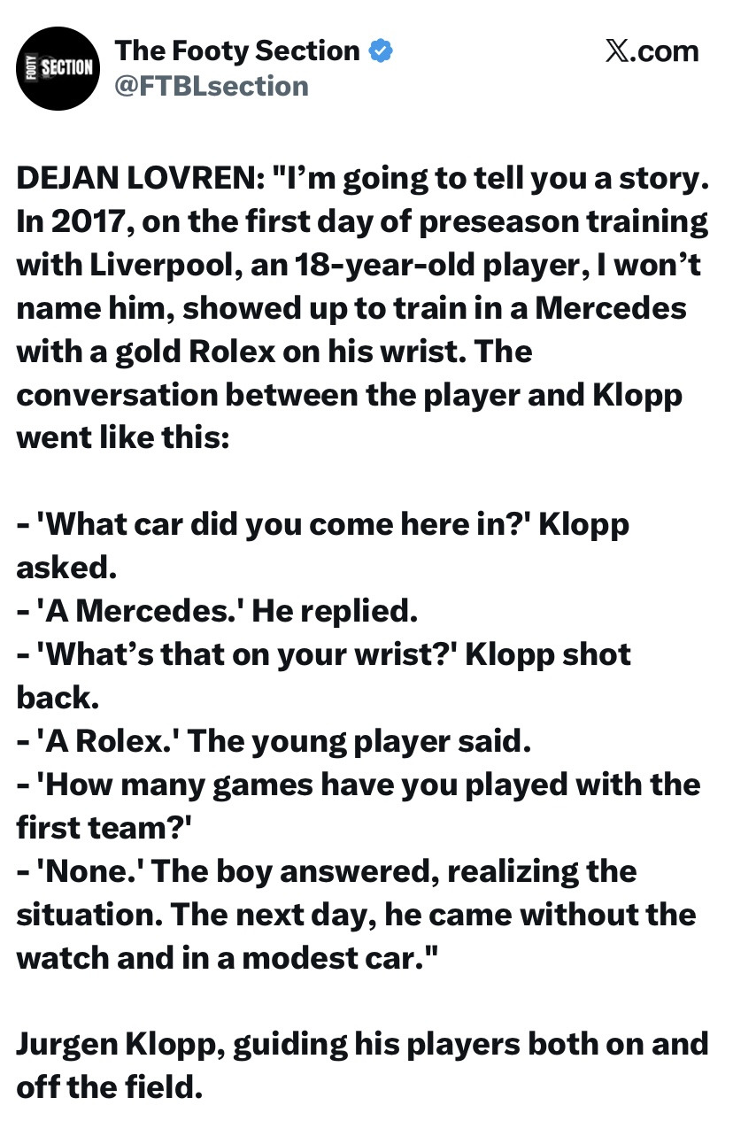 실명은 밝히지 않겠지만, 2017년 리버풀 프리시즌 훈련 첫날에 18살 선수가 훈련장에 벤츠 타고 손목에 금색 롤렉스를 차고 왔죠. 그 선수와 클롭의 대화는 다음과 같았어요.