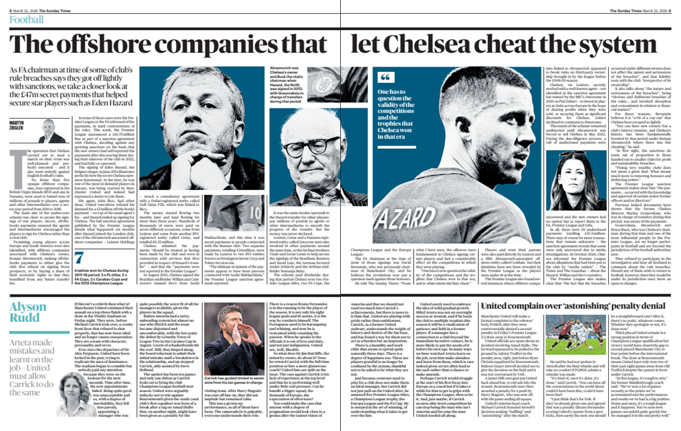 프리미어리그가 공개한 제재 합의문은 이후 상황을 상세히 설명한다. 아자르가 첼시에 합류한 지 6개월 뒤, 로만과 연관된 역외 기업 중 하나인 Leiston Holdings는 두바이에 등록된 Gulf Value FZE와 컨설팅 계약을 체결했는데, 이 회사는 비코와 연관된 곳이었다.