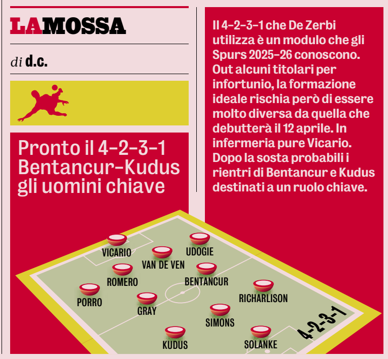 데 제르비가 사용하는 4-2-3-1 포메이션은 이번 시즌 토트넘 선수들에게 익숙한 포메이션이다. 하지만 몇몇 주전 선수들이 부상으로 이탈하면서, 이상적인 베스트 일레븐은 4월 12일 데뷔전에 나설 팀과는 상당히 다를 가능성이 크다. 비카리오 역시 부상으로 이탈했다. A매치 휴식기 이후에는 벤탄쿠르와 쿠두스가 복귀하여 핵심 역할을 맡을 것으로 예상된다.