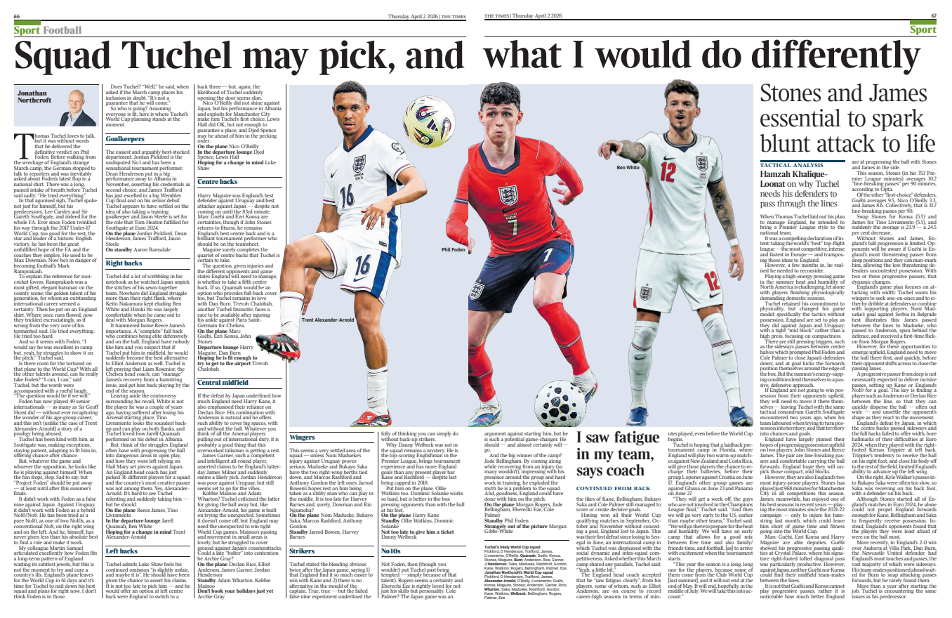 코비 마이누와 애덤 워튼? 투헬은 워튼이 볼을 잃는다고 비판했지만, 알렉산더-아놀드처럼 그의 경기 스타일은 예상치 못한 플레이를 시도하는 데 기반을 두고 있다. 때로는 실패하지만, 잉글랜드는 월드컵에서 치열한 경기에서 승리하고자 이런 예측 불가능한 플레이가 필요할 수도 있다.