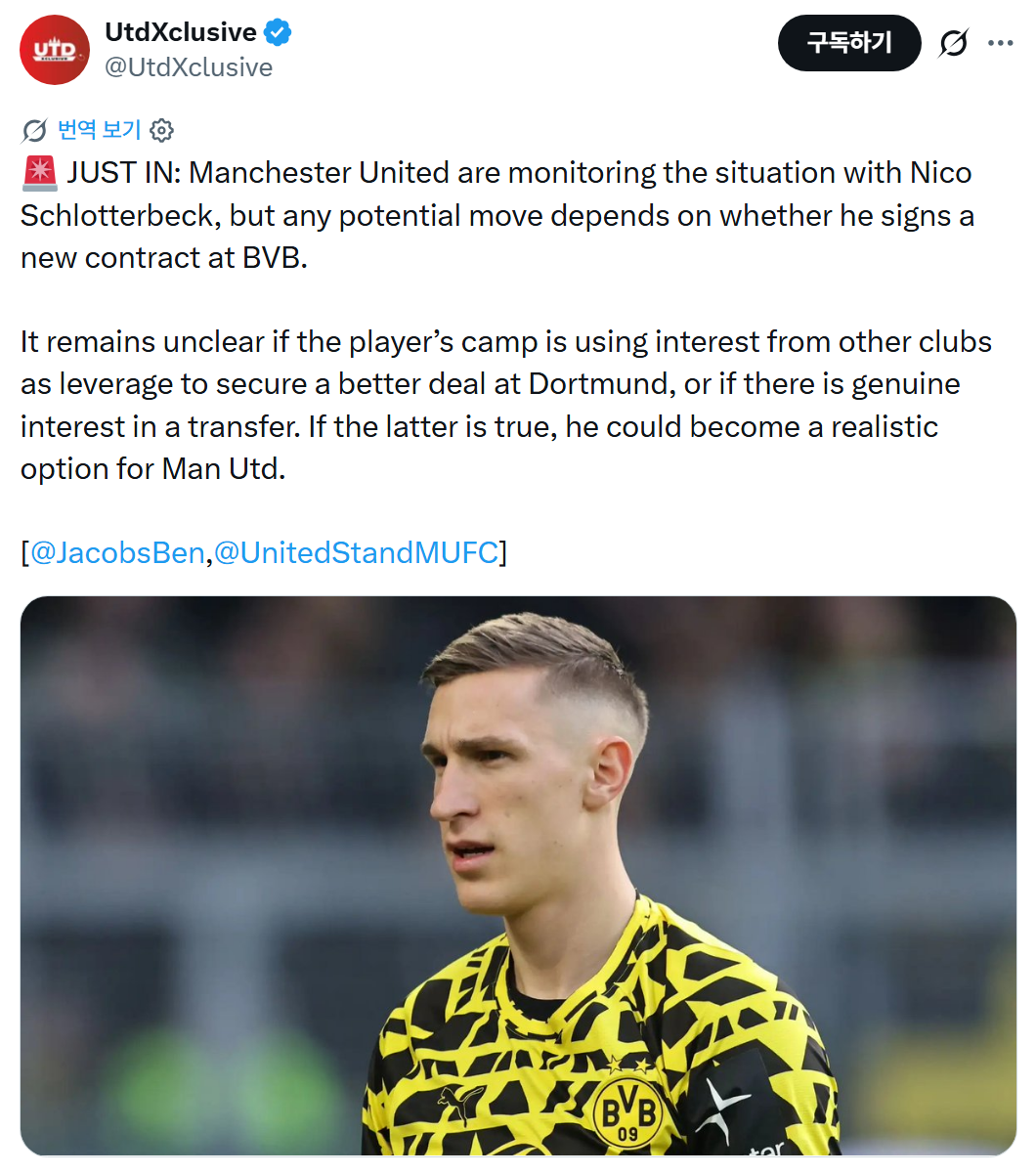 맨체스터 유나이티드가 니코 슈로터베크의 상황을 주시하고 있지만,