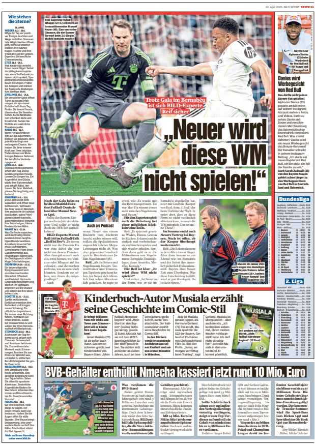 “노이어 나이에서는 회복에 더 오랜 시간이 걸린다. 하지만 베르나베우 원정과 같은 밤이 찾아오면, 분명 그의 내면에 많은 생각거리를 던져줄 것이다. 바이언은 (이번 여름에 계약이 만료되는) 노이어에게 충분히 생각할 시간을 주고 있다. 노이어는 결정에 관해서 신중하게 고민할 것이며, 전혀 서두를 필요는 없다.”