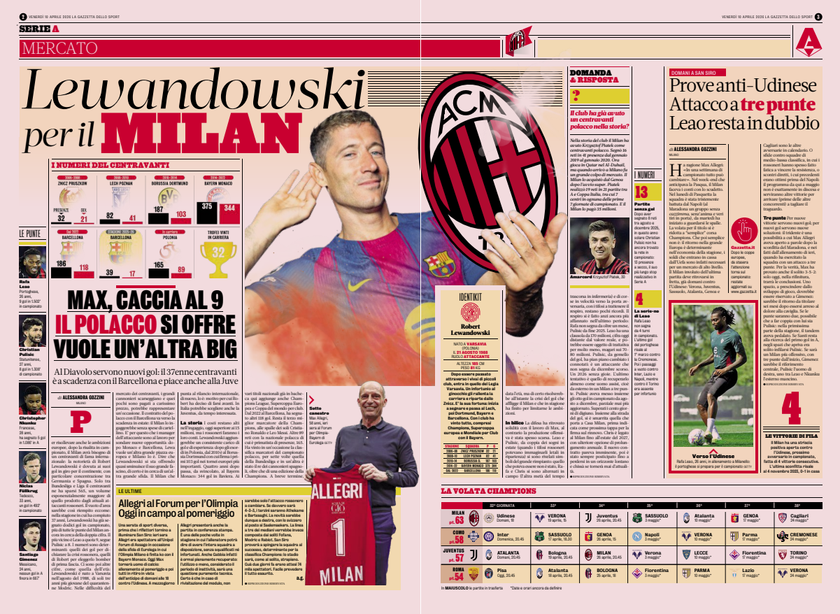 밀란 공격진은 여전히 득점력이 부족하다. 이번 시즌 37세가 된 레반도프스키는 이미 리그에서 12골을 기록 중이며, 이는 밀란 공격수들 전체보다도 높은 수치다.