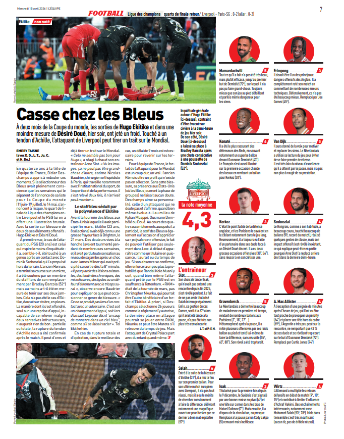 디디에 데샹은 프랑스 대표팀 사령탑을 맡은 14년 동안 지금과 같은 순간들을 두려워해 왔다. 데샹은 월드컵 명단 발표일인 5월 14일을 앞두고 몇 주가 위험한 시기가 될 것임을 잘 알고 있었지만, 리버풀과 파리의 경기는 이를 극명하게 보여주는 사례가 되었다.