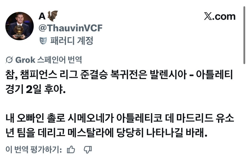 발렌시아 팬: 시메오네 우리한테도 풀로테 돌려주셈 작성자Apink|작성시간26.04.15|조회수352 목록 댓글 1 글자크기 작게가 글자크기 크게가 https://x.com/thauvinvcf/status/2044169054135394800?s=46X의 A🦇님(@ThauvinVCF)Por cierto, la vuelta de las Semifinales de Champions es 2 días después del Valencia - Atleti. Espero que mi hermano el Cholo Simeone se plante en Mestalla con el Alevin del Atlético de Madrid.x.com 다음검색 현재 게시글 추가 기능 열기 북마크 공유하기 신고 센터로 신고 댓글 댓글 1 댓글쓰기 답글쓰기 댓글 리스트 작성자Dennis Cirkin | 작성시간 26.04.15 지금 챔스 올인급이라 풀로테는 아니어도 최소 1.7군으로 나올듯요 댓글 전체보기