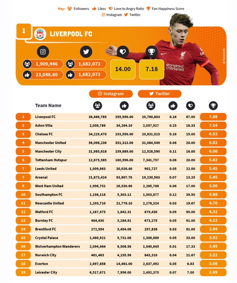 리버풀은 구단 인스타와 트위터 게시물당 평균 좋아요 수가 매우 높으며 전반적으로 좋은 점수를 받았으며, 클럽에 대해 토론하는 기사들의 반응이 “분노”반응보다 “사랑”의 반응 비율이 매우 높습니다.