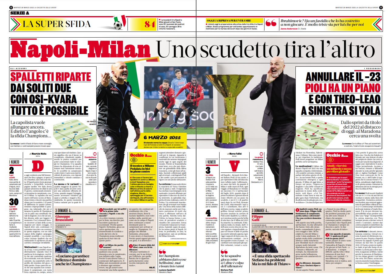 먼저 일요일 리그에서 무슨 일이 일어나든 챔피언스리그에 영향을 미치지 않으리라 생각한다. 접근 방식부터 모든 것이 달라질 것이기 때문이다. 밀란은 분명히 작은 실수를 이용할 준비가 되었겠지만, 나폴리는 정말 좋은 팀이고 지금까지 보여준 경기력을 계속 보여줄 것으로 기대한다. 나폴리는 수비도 잘하고 공격도 잘하는 팀이다. 저는 그들이 성공할 것이라고 확신한다. 이들은 즐기면서 뛴다.